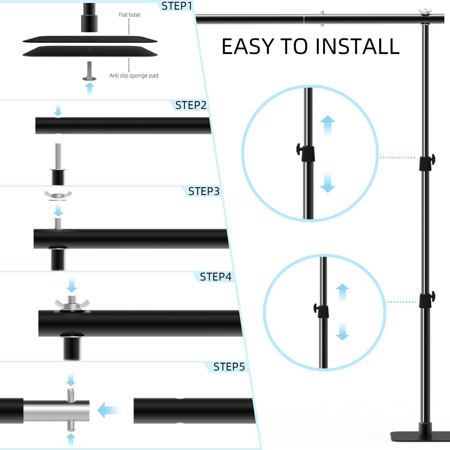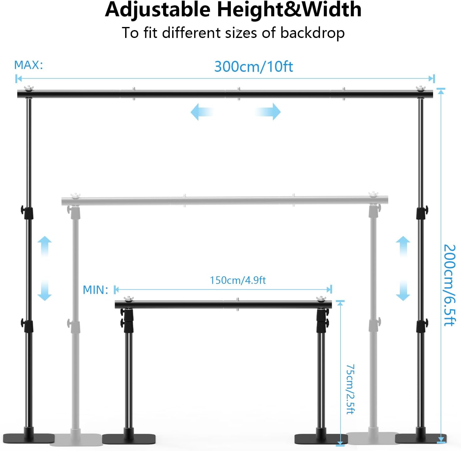 - 【Adjustable Telescopic Backdrop Stand】The backdrop stand is designed as a 4 section crossbar, making it more flexible in use. The Min. Width: 5ft (2 PCS crossbar), the Max. Width: 10ft (4 PCS crossbar). You can adjust to the appropriate width to fit different sizes of backdrop. And the height is adjustable from 2.7 ft to 10 ft.
