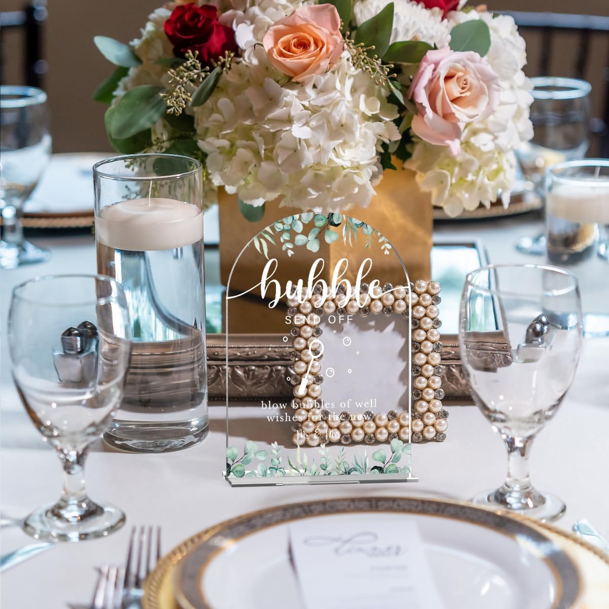 Acrylic Wedding Sign Bubble Send Off Signs for Ceremony Modern Calligraphy Arch Acrylic Table Top Signs for Wedding Reception and Event Party Table Decor (Eucalyptus Leaves)