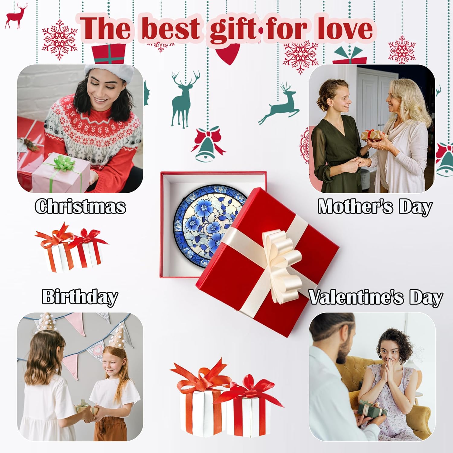 Stained Glass Window Hanging, Blue and White Plum Blossom Sun Catcher for Door Home Decor Flowers Suncatcher Christmas Mother's Day Birthday Gifts for Women Men Mom and Nana 6.3 in