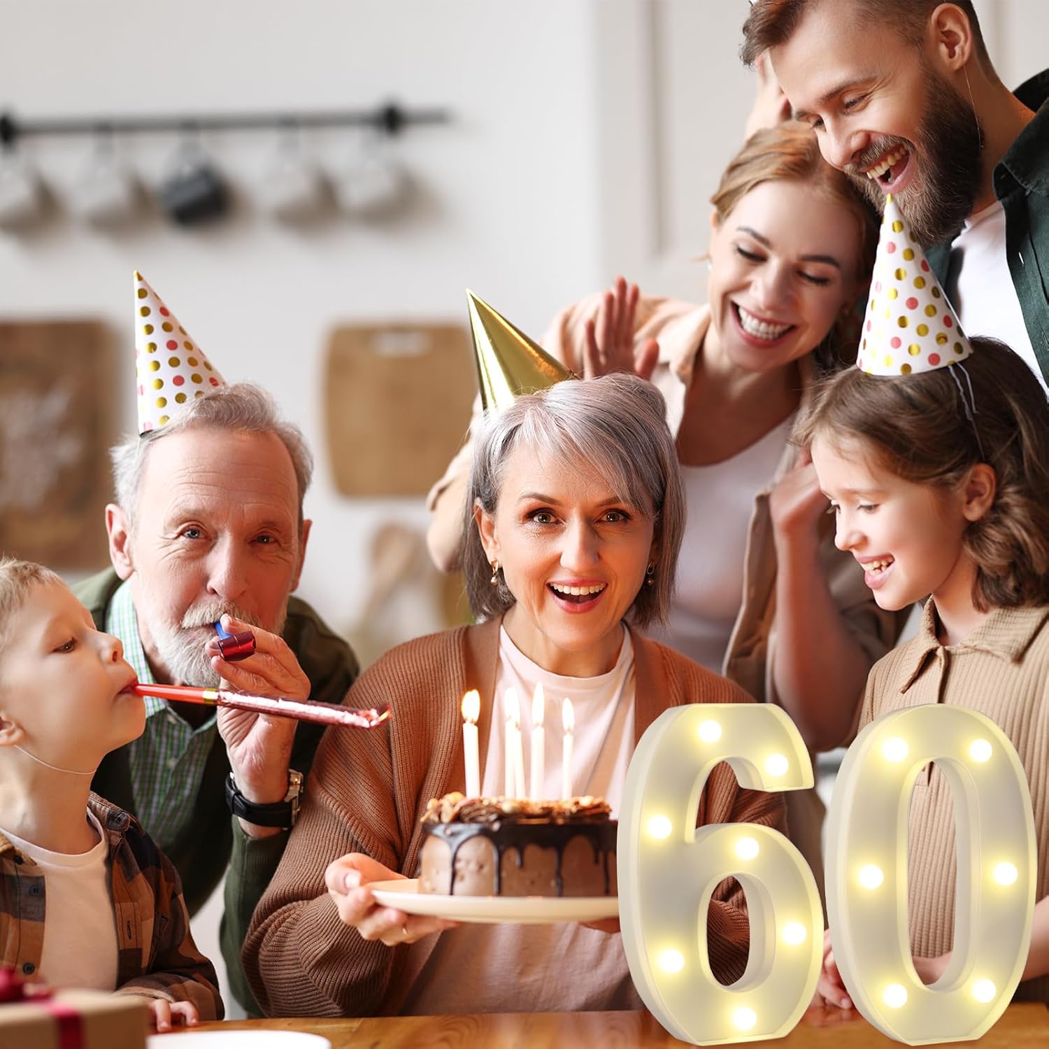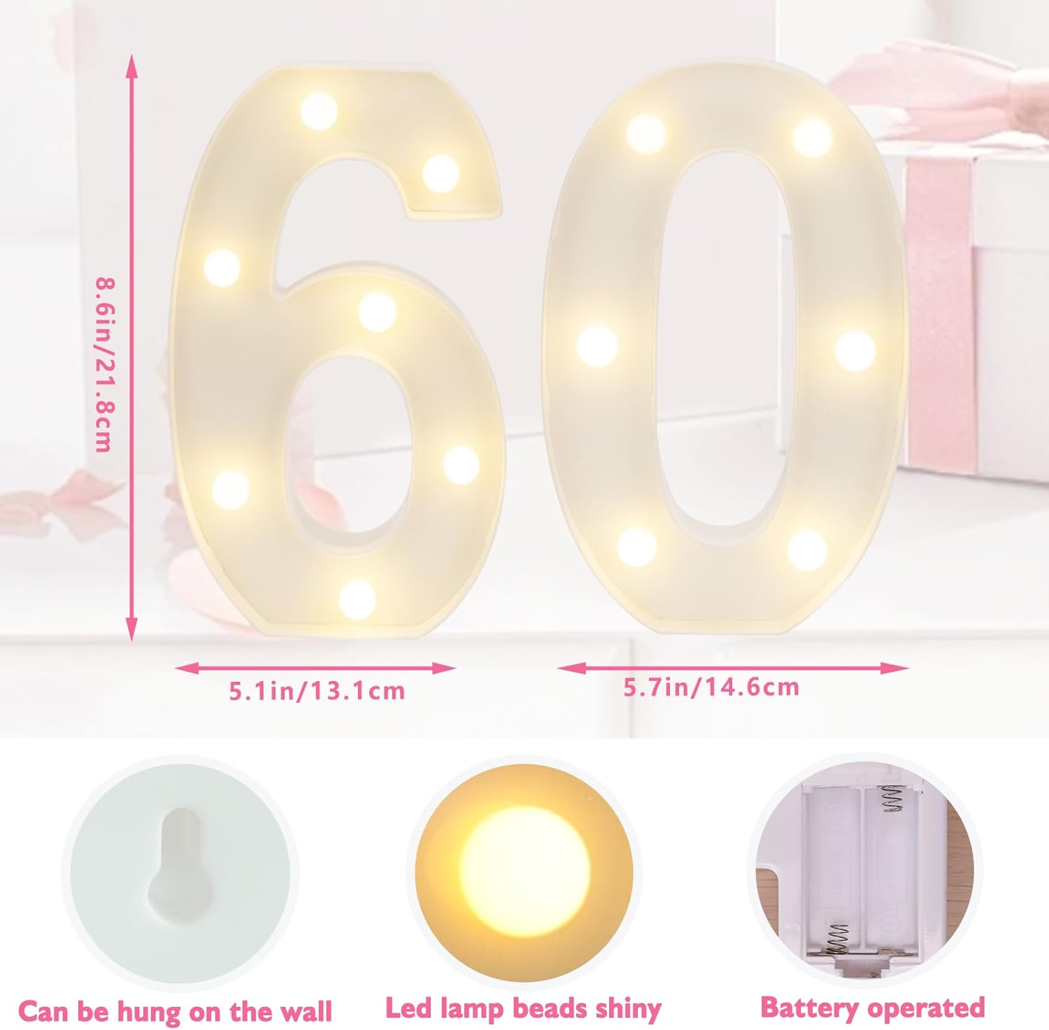 - 【Light Up Your Birthday】 Light up number lights are great birthday party supplies and decorations, perfect for all kinds of scenes and memorable moments. Light up your birthday party by spelling out “60” with our number lights, light up the wonderful moments, warm white lights create a cozy atmosphere, make your 60th birthday party more memorable and sparkling!