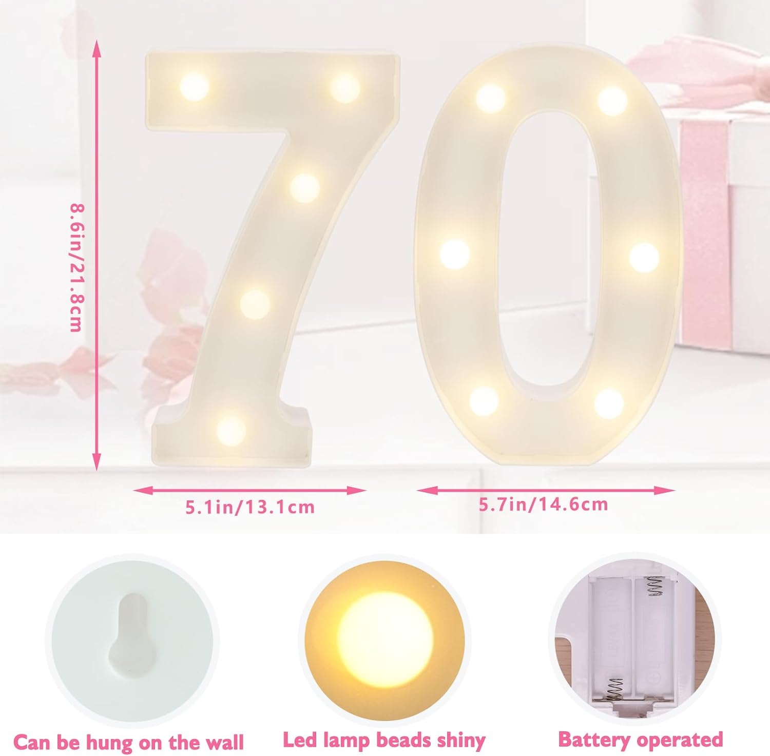 - 【Light Up Your Birthday】 Light up number lights are great birthday party supplies and decorations, perfect for all kinds of scenes and memorable moments. Light up your birthday party by spelling out “70” with our number lights, light up the wonderful moments, warm white lights create a cozy atmosphere, make your 70th birthday party more memorable and sparkling!