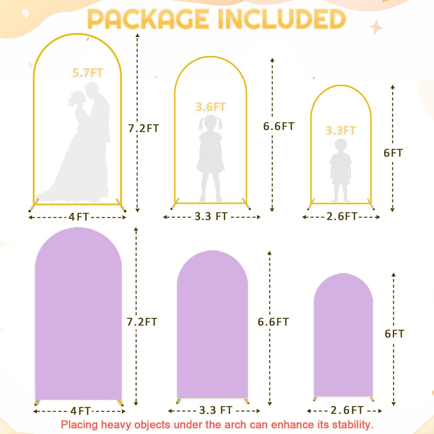 - đ„ăPackage Included - Metal Arch Backdrop Stand and Cover SetăYou will receive 3 gold metal arch backdrop stand and 3 lavender arch cover. Size: Size: 7.2ft H x 4ft W, 6.6ft H x 3.3ft W, 6ft H x 2.6ft W. Let's create unforgettable moments with our arch backdrop stand cover!