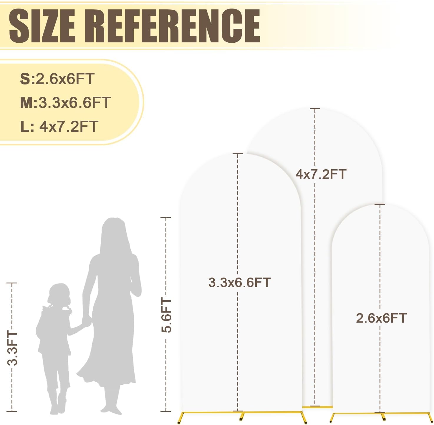 - ⭐Size Guide - Metal Arch Backdrop Stand and Cover: The size of arch backdrop stand set about are 2.6FTx6FT(W x H), 3.3FTx6.6FT(W x H), 4FTx7.2FT(W x H) with white arch cover set. Metal arch backdrop stand set add a graceful and striking look for your party or event.