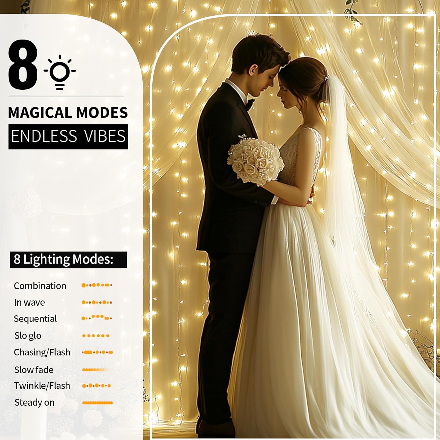 - All-Event Versatility: Perfect for creating magical backdrops at: Weddings (ceremonies, receptions, arches, bridal showers), Milestone Events (baby showers, birthdays, graduations), Photo Sessions (booths, portrait lighting), Seasonal Decor (Christmas windows, Halloween parties), Commercial Displays (stores, dessert tables, trade shows)