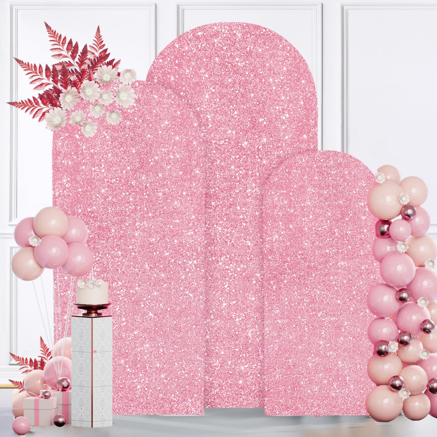 MODFUNS Metal Arch Backdrop Stand and Cover Set 6&6.6&7.2ft Pink Gold Sequins Arch Backdrop Covers Set of 3 Arched Stands Chiara Arches Cover for Party Banquet Wedding Ceremony Decor