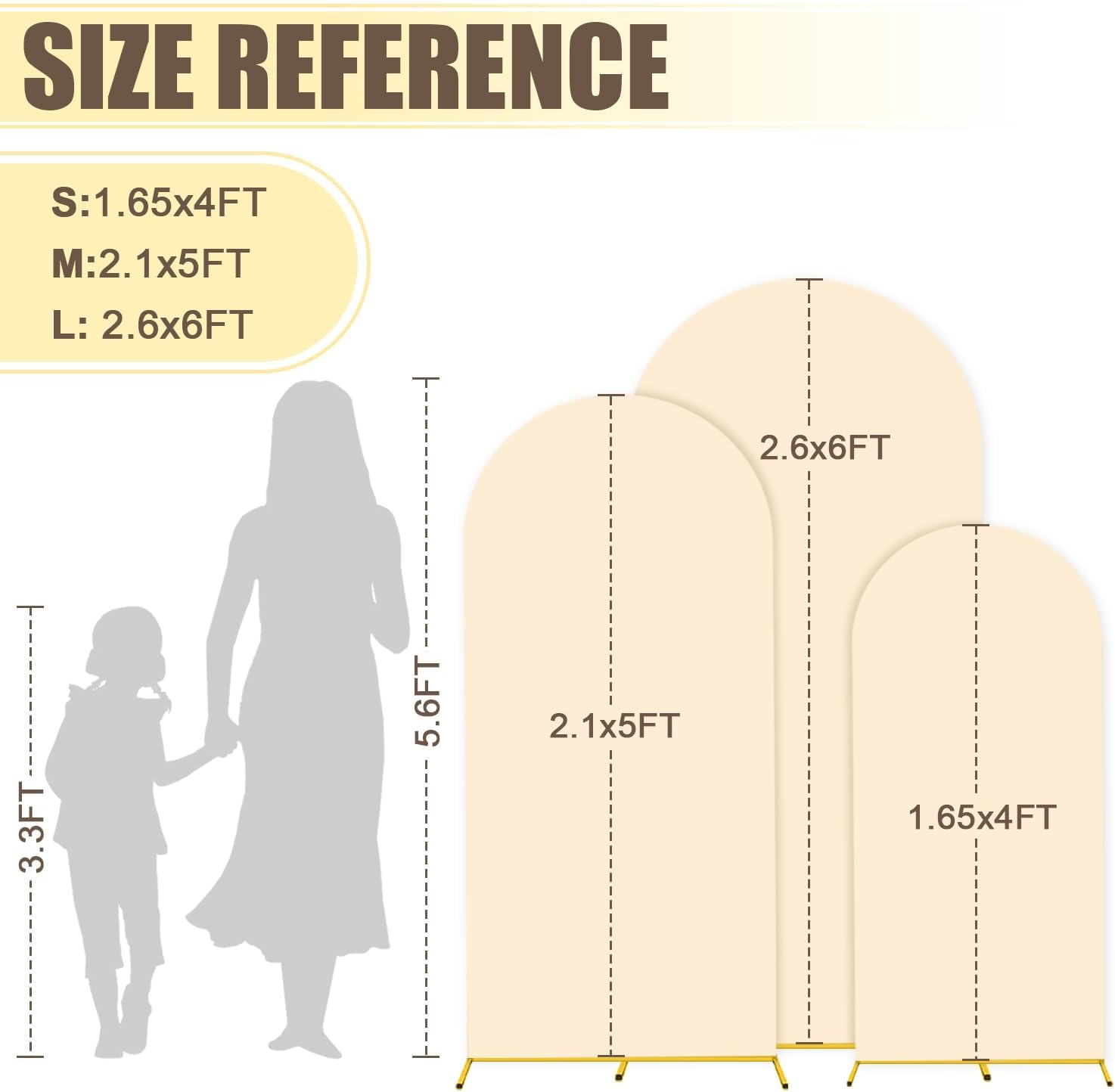 - ⭐Size Guide - Arch Backdrop Stand and Cover Set: The size of arch backdrop stand set about are 1.25FTx4FT(W x H), 2.1FTx5FT(W x H), 2.6FTx6FT(W x H) with khaki arch cover set. Metal arch backdrop stand set add a graceful and striking look for your party or event.