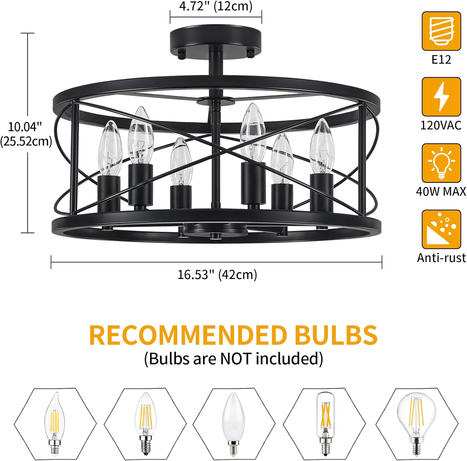 - Practical Open-Frame Light Fixture: With a non-glass, open-frame design, this semi flush mount ceiling light is both safe and low-maintenance. It prevents bug and dust accumulation, making frequent cleaning unnecessary. The lamp accommodates four E12 sockets (each supporting up to 40W) and is compatible with LED, CFL, and halogen bulbs. This hanging light fixture offers superior functionality for use as hallway light fixtures or as ceiling light fixtures in kitchens and living rooms