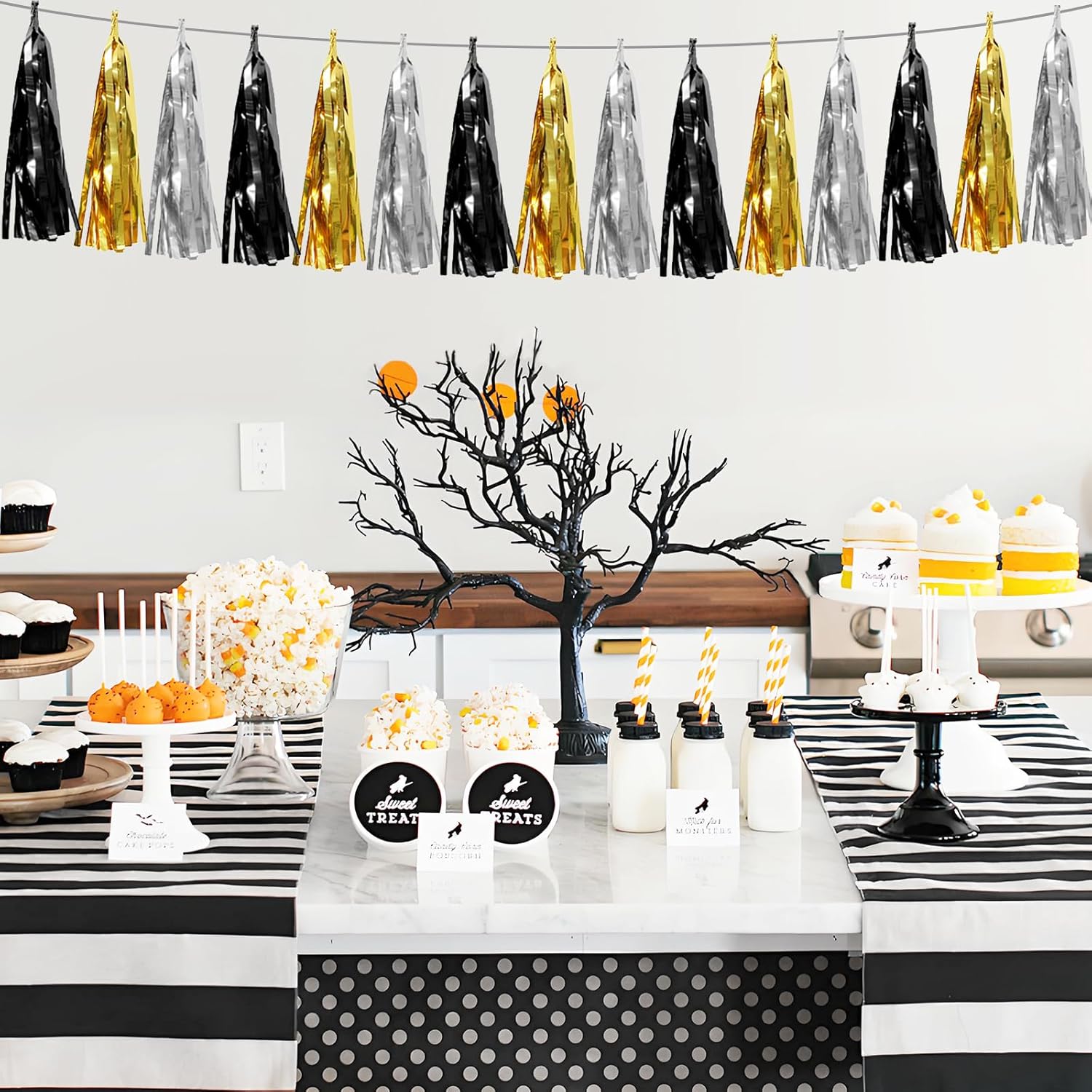 4P Black Gold Silver Foil Fringe Tassel Garland Banner Metallic Tinsel Streamers Wall Hanging Curtain Backdrop Banner for Parade Floats, 2025 Graduation Decorations,New Years Decorations, Father' Day