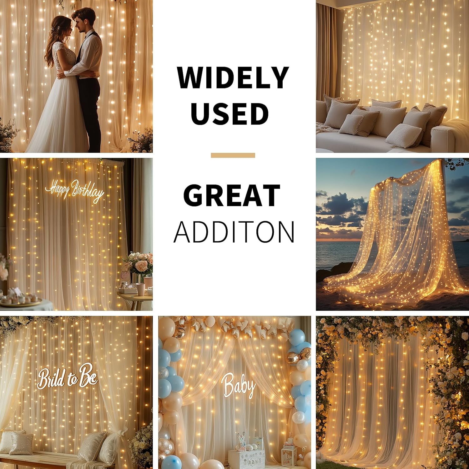 - Elegant Combination of Tulle Backdrop Curtains and Lights - Package Includes: 2 panels champagne sheer tulle backdrop curtains (5ft x10ft each, total 10x10ft).1 set of a 10x10ft warm white USB-powered tangle-free string lights (10 strands with 300 LEDs). 12 Transparent clips for hassle-free Installation. (Pro Tip: Buy multiple sets for fuller coverage and reduced sheerness!)
