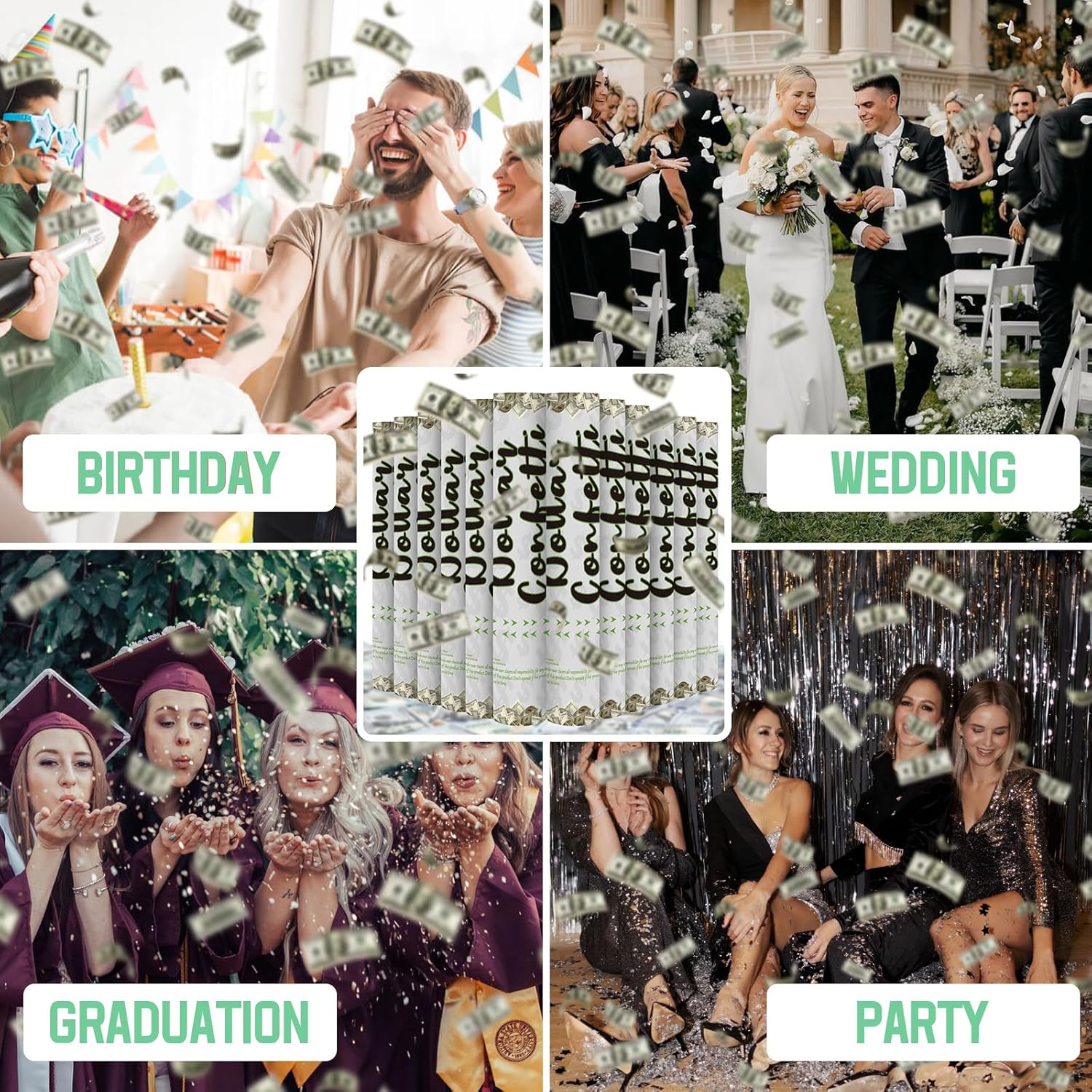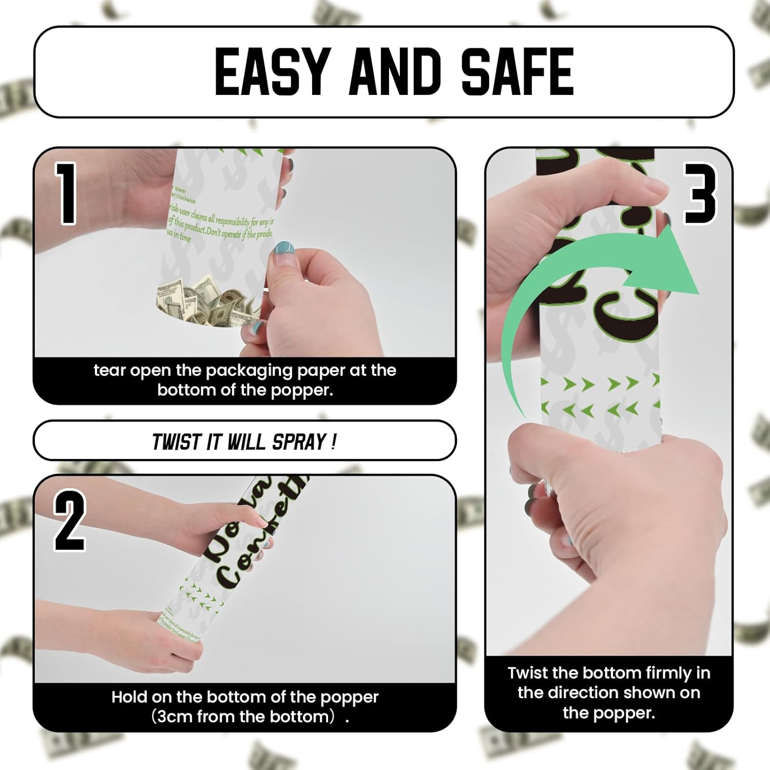 - Party Poppers with Money Confetti - Our confetti poppers 12 inch are made of high quality confetti, ensuring a celebartion that's both fun and safe. confetti popper cannons are for any occasion, form weddings and engagements to birthdays and anniversaries, graduation Christmas New Year party.