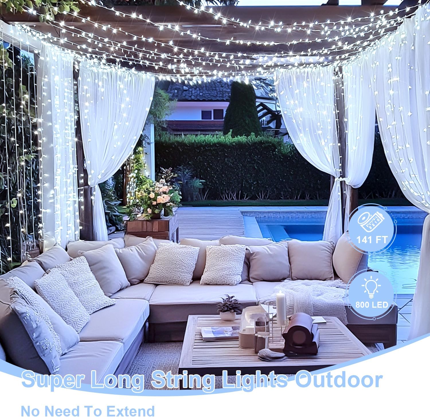 - 【Super Long & Super Bright 】The bright christmas string lights with 800 white LED .You can have an extra-long LED string lights,which is enough to surround and decorated your porch. It use ultra-high intensity LEDs for smooth,soft and bright lighting to create a delighted, joyful, unique sentimen for daily decor, party, wedding, thanksgiving day, indoors and outdoors.