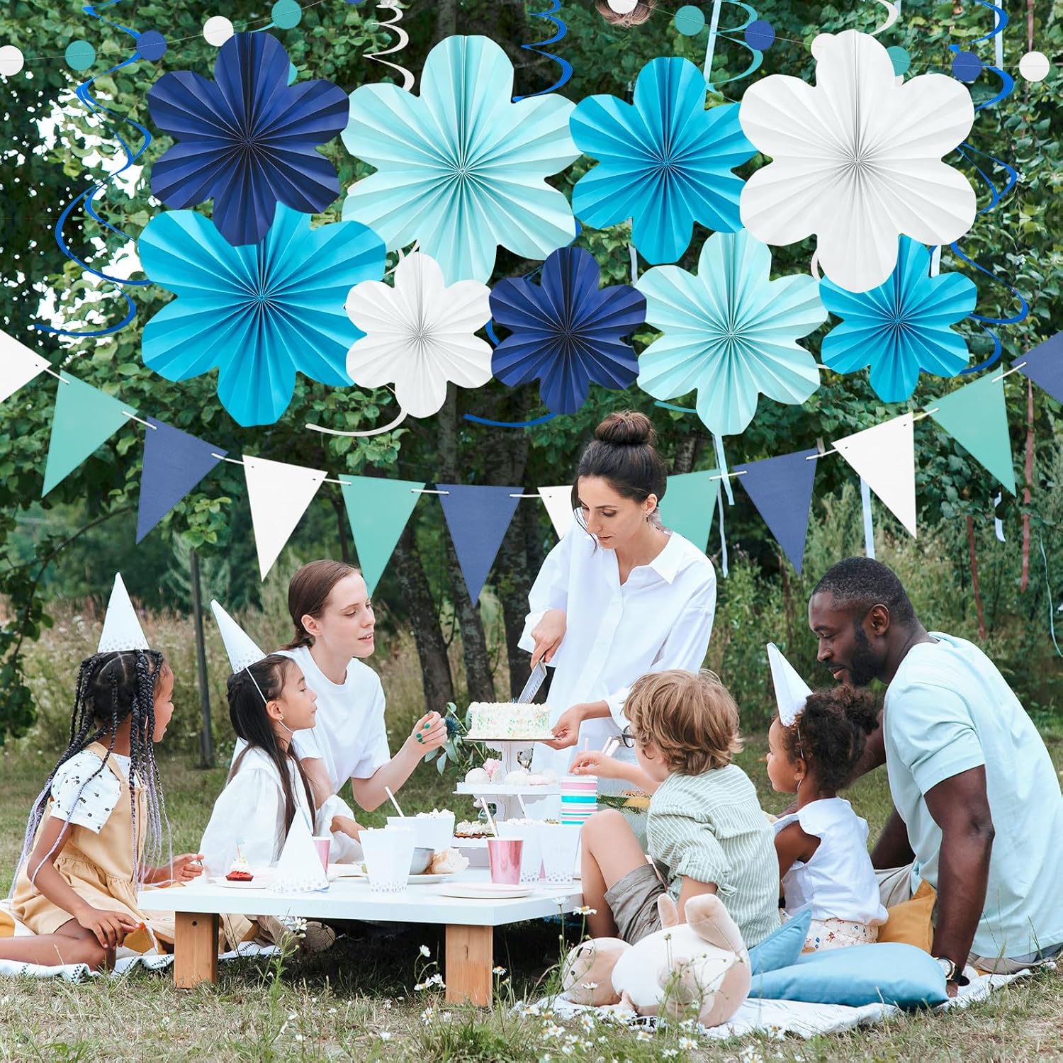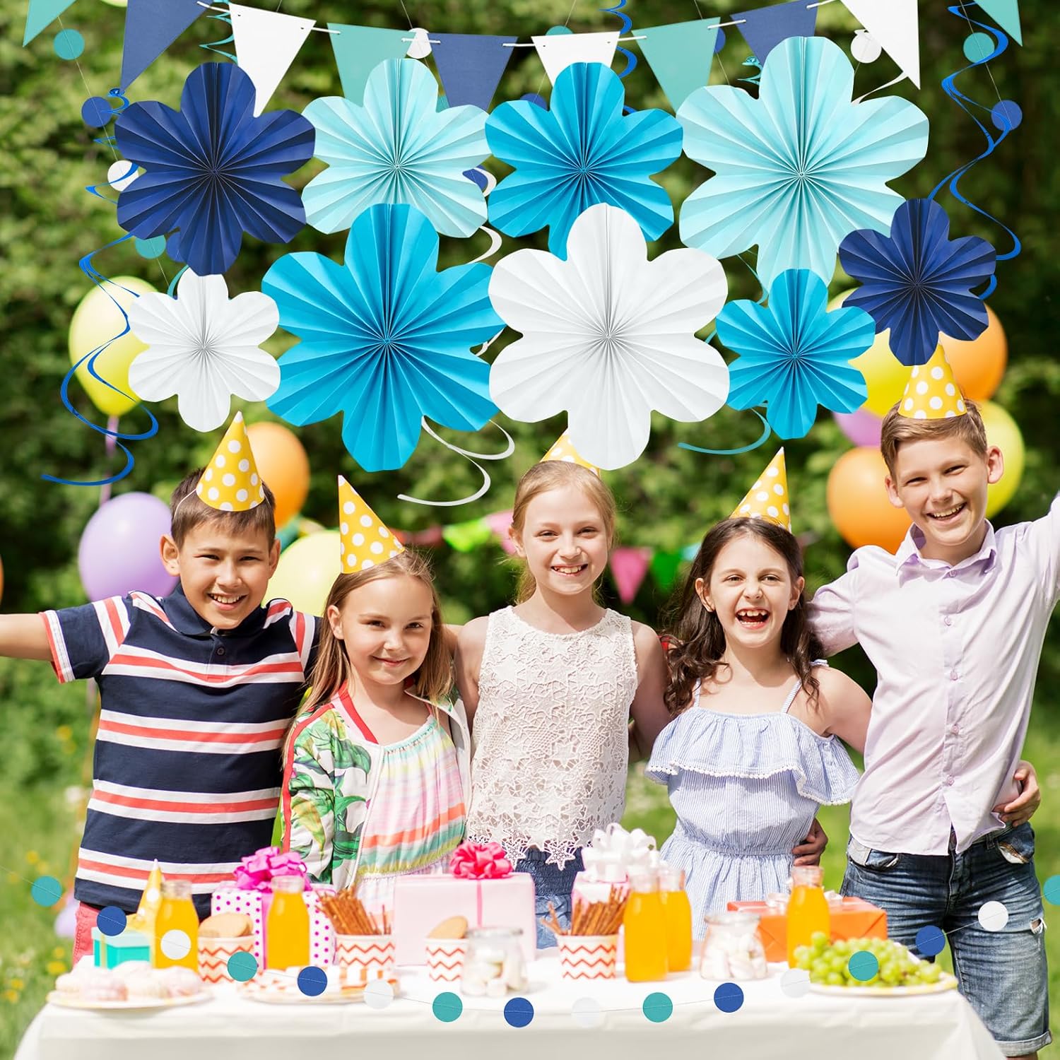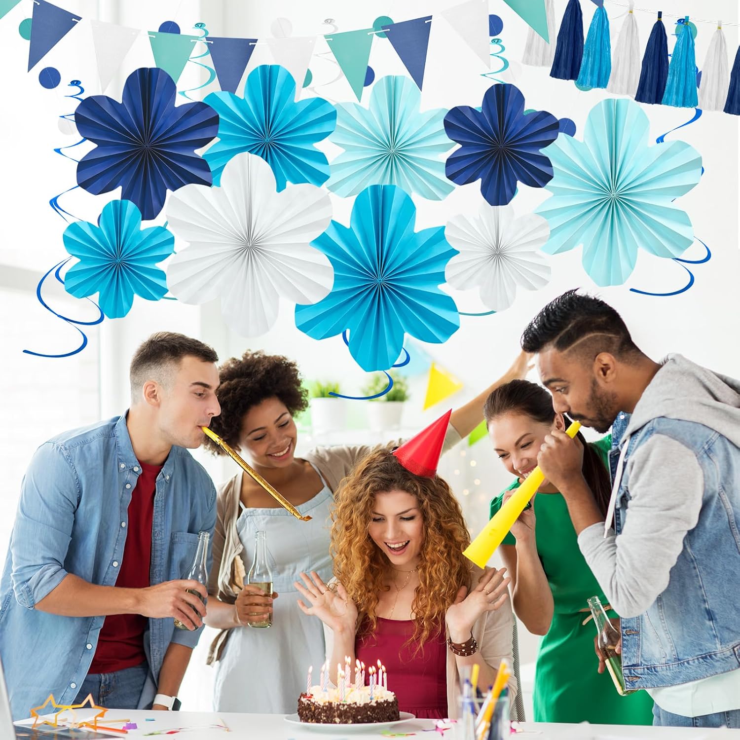 - Blue Party Decorations: Our navy blue paper fans decorations kit includes 3 pcs 12’’ paper flowers, 3 pcs 10’’ paper flowers, 3 pcs 8’’ paper flowers, 9 pcs hanging swirls, 1 pcs 6.56ft tasseled garland, 1 pcs 6.56ft triangular pennants, 2 pcs circle dot garland, 2 pcs ribbon.