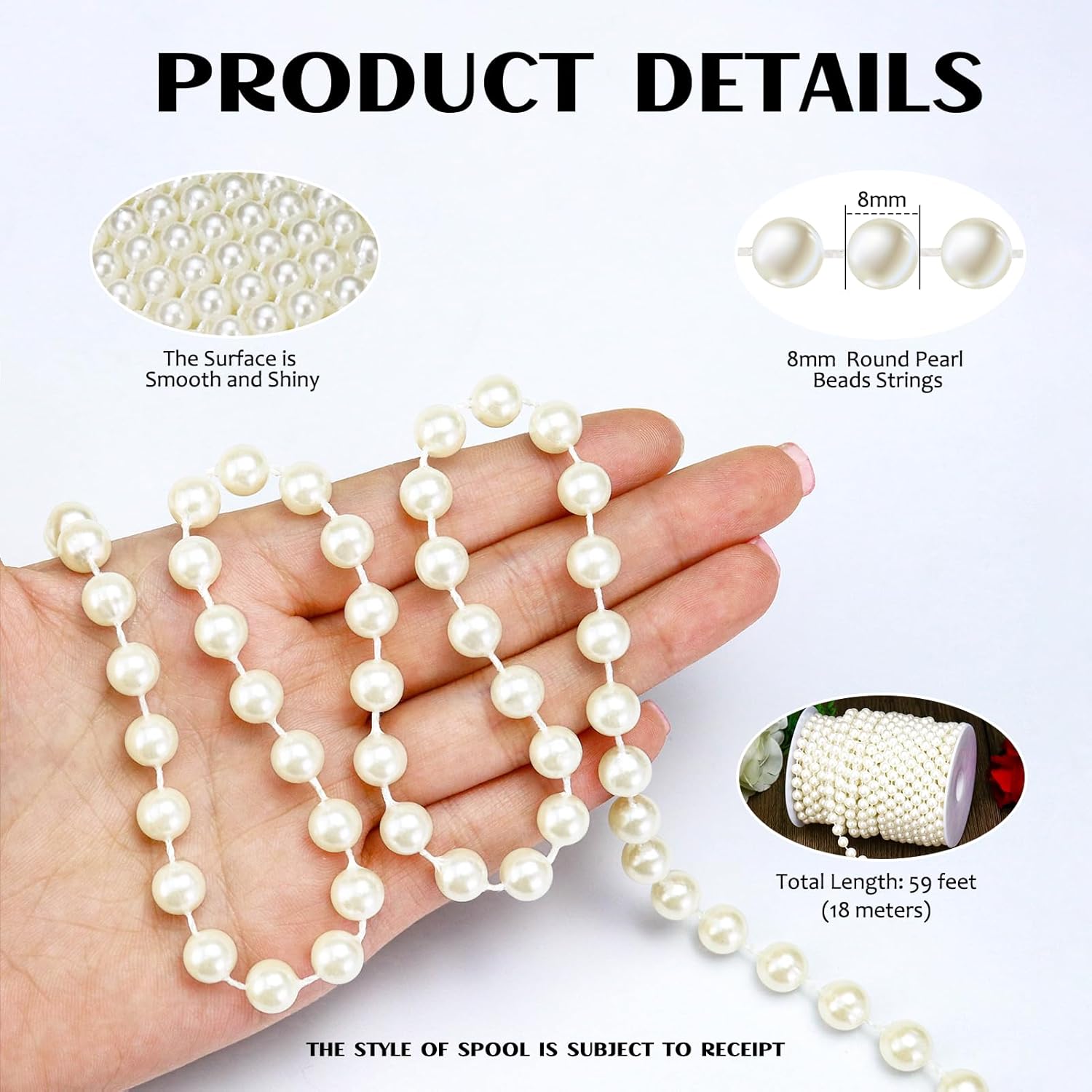 - You Will Receive a roll of faux pearl garland strings, totally 59 feet (18 meters) in length, the round pearl beads is 8mm in diameter