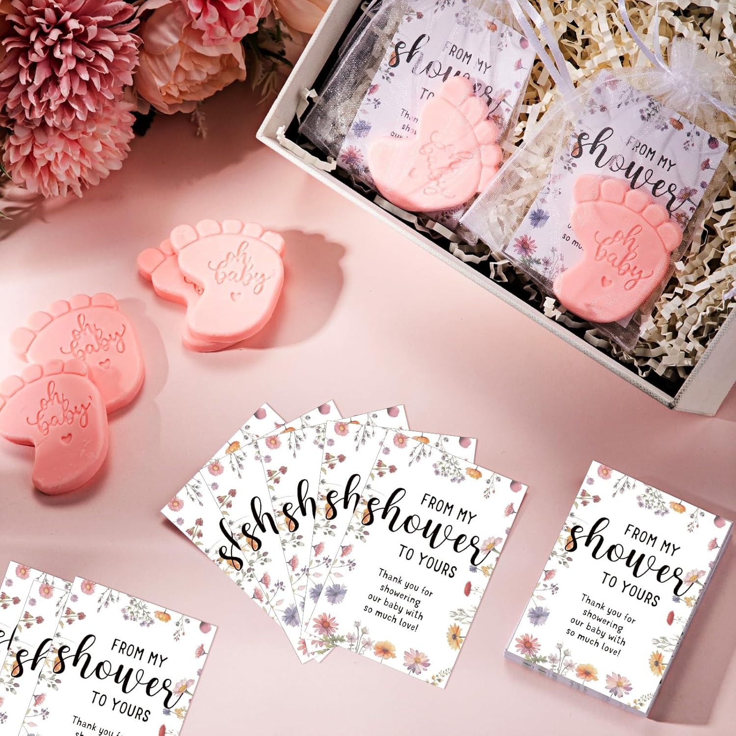 - Baby Shower Soaps: these baby shower soaps are made from natural vegetable oil soap base and glycerin, ensuring skin friendly and smooth usage; The package is a complete set containing 50 handmade soaps, 50 thank you cards, and 50 organza bags, making it a comprehensive and excellent gift choice for your guests