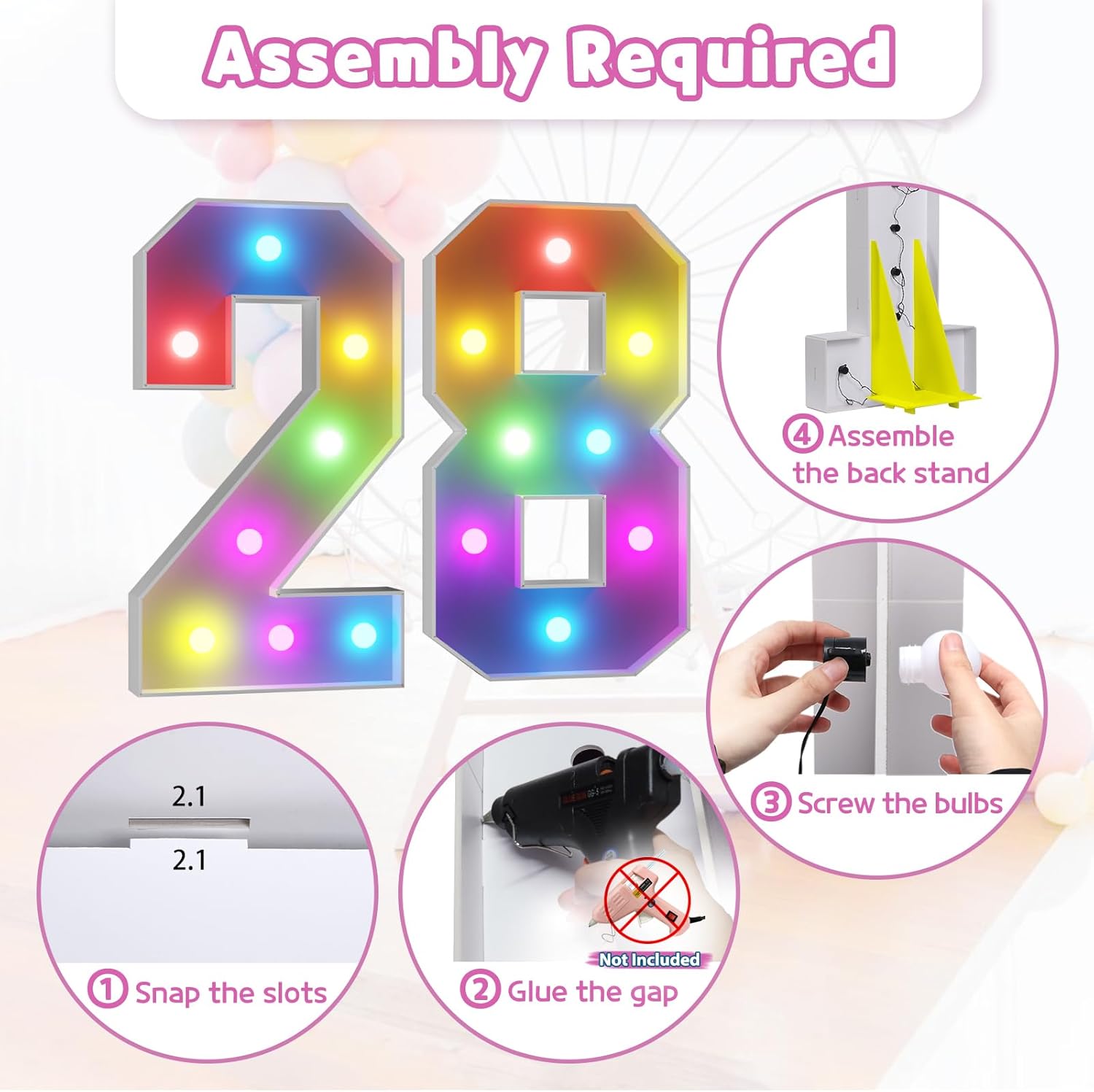Marquee Numbers 28th-Birthday Decoration: Colorful 3FT Large Light Up 28 Year Old Birthday Decorations Anniversary Backdrop for Boys Girls Cardboard Sign 18 Colors Number 28 Mosaic Balloon Frame