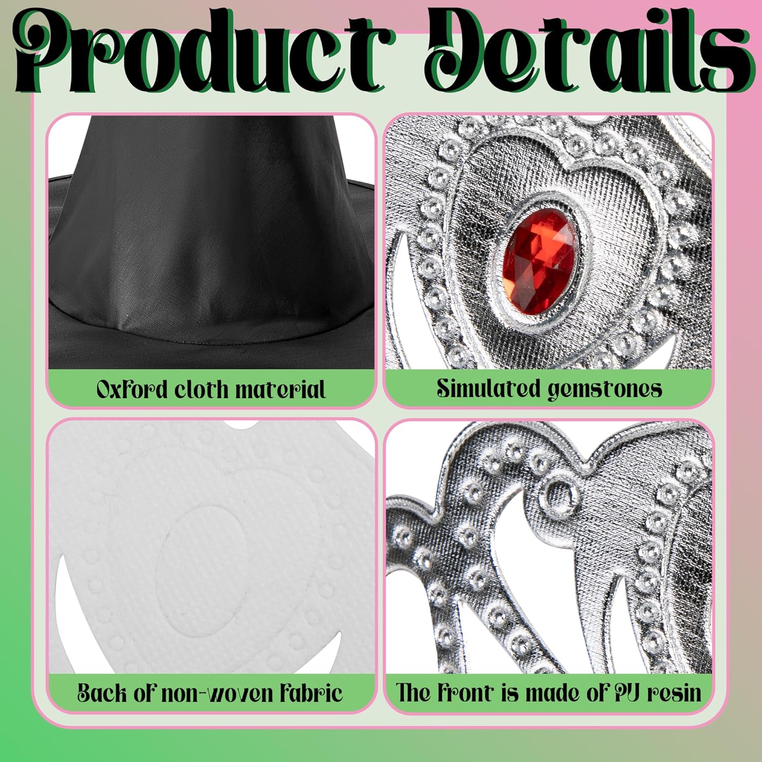 - Comfortable Material: The witch hat is made of Oxford fabric, which is breathable and comfortable for wearing. The princess crown is made of a PU resin surface and a non-woven material backing, making it gentle on the skin