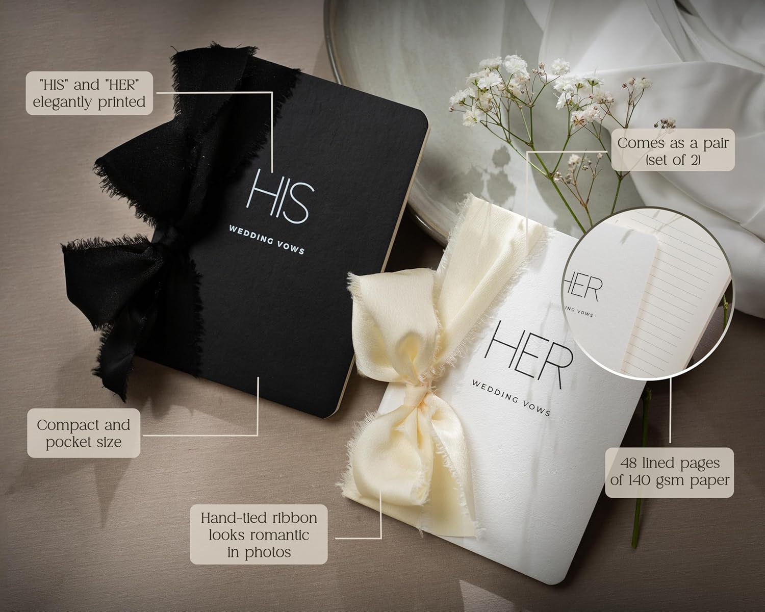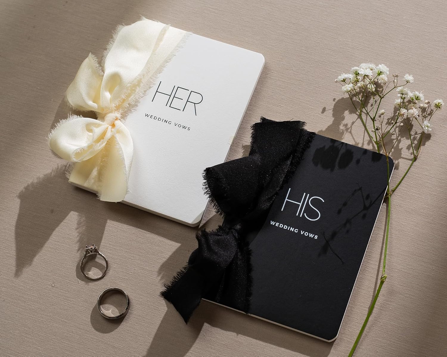 - Each vow book in our set measures 5.625 x 4 x .5 inches, making them pocket-sized for easy carrying. Crafted from high-quality materials, these softcover vow books offer durability with a sophisticated finish. The flowy ivory ribbon adds a touch of romance and softness against the texture of the book.