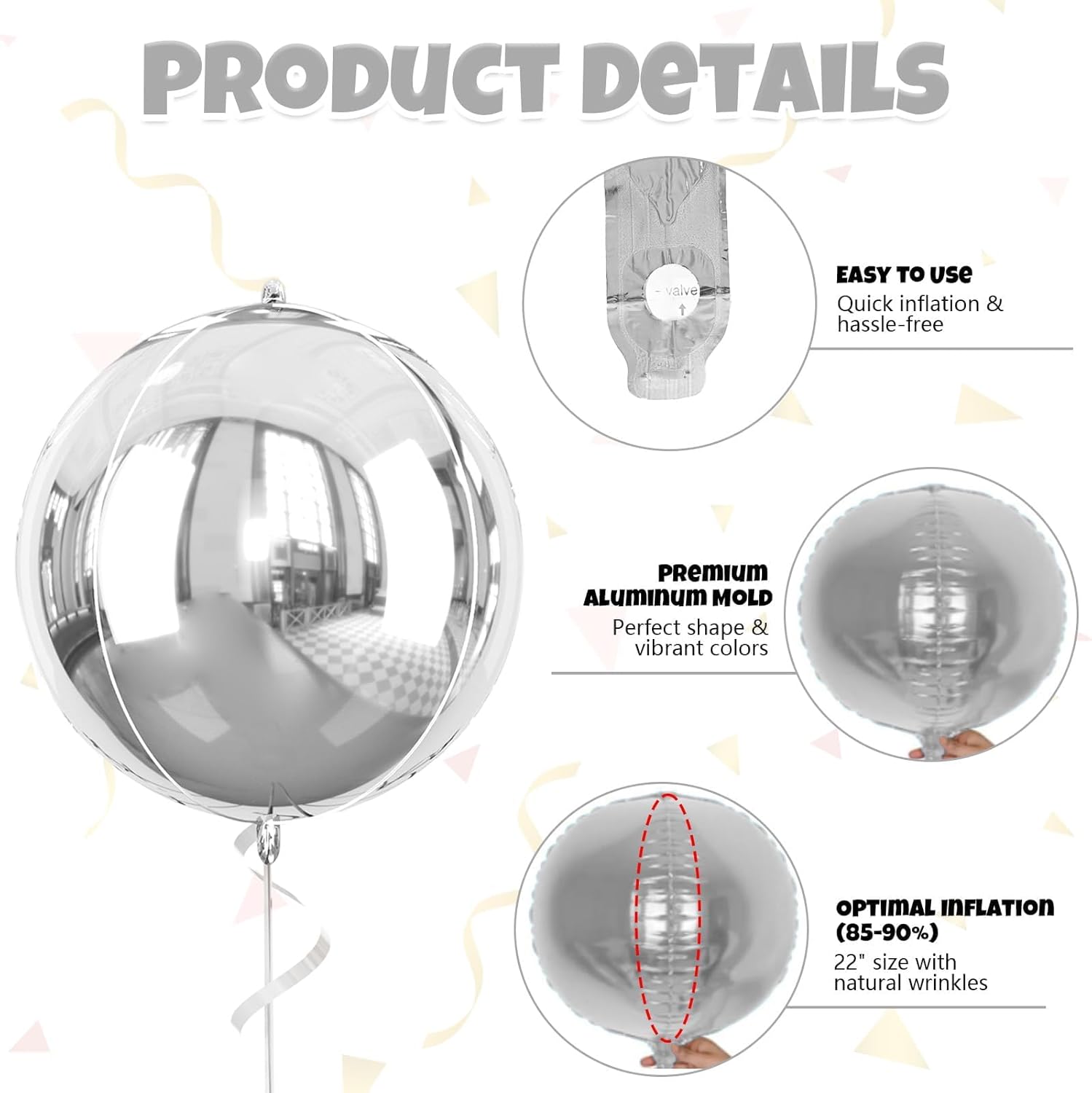 - 【PACKAGR CONTAIN】 This package includes 6 pcs 22-inch silver round 4D foil balloons, 1 pc straw and 1 pc ribbon. These large, eye-catching balloons are perfect for elevating your party decor with a bold and stylish touch