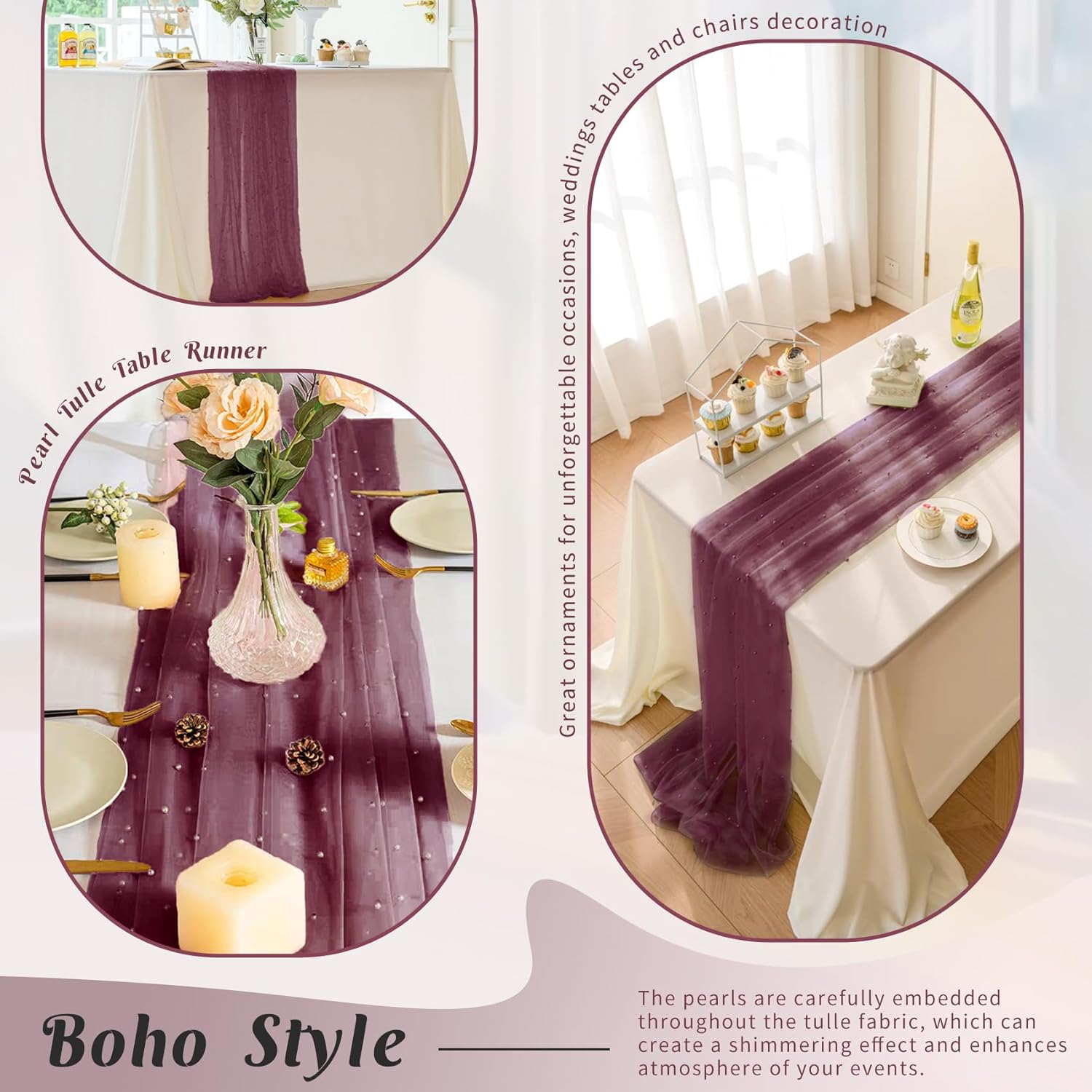 - 【Package Include】 You will receive 1 pieces of 29 x 120 inches pearl tulle table runners. The pearls delicately added give this an elegance to elevate table decor, it's long enough to fit different size tables and chairs, These tulle table runner with pearls are skin-friendly. There are lots of different colors for you to choose. Perfect to decorate your tables.