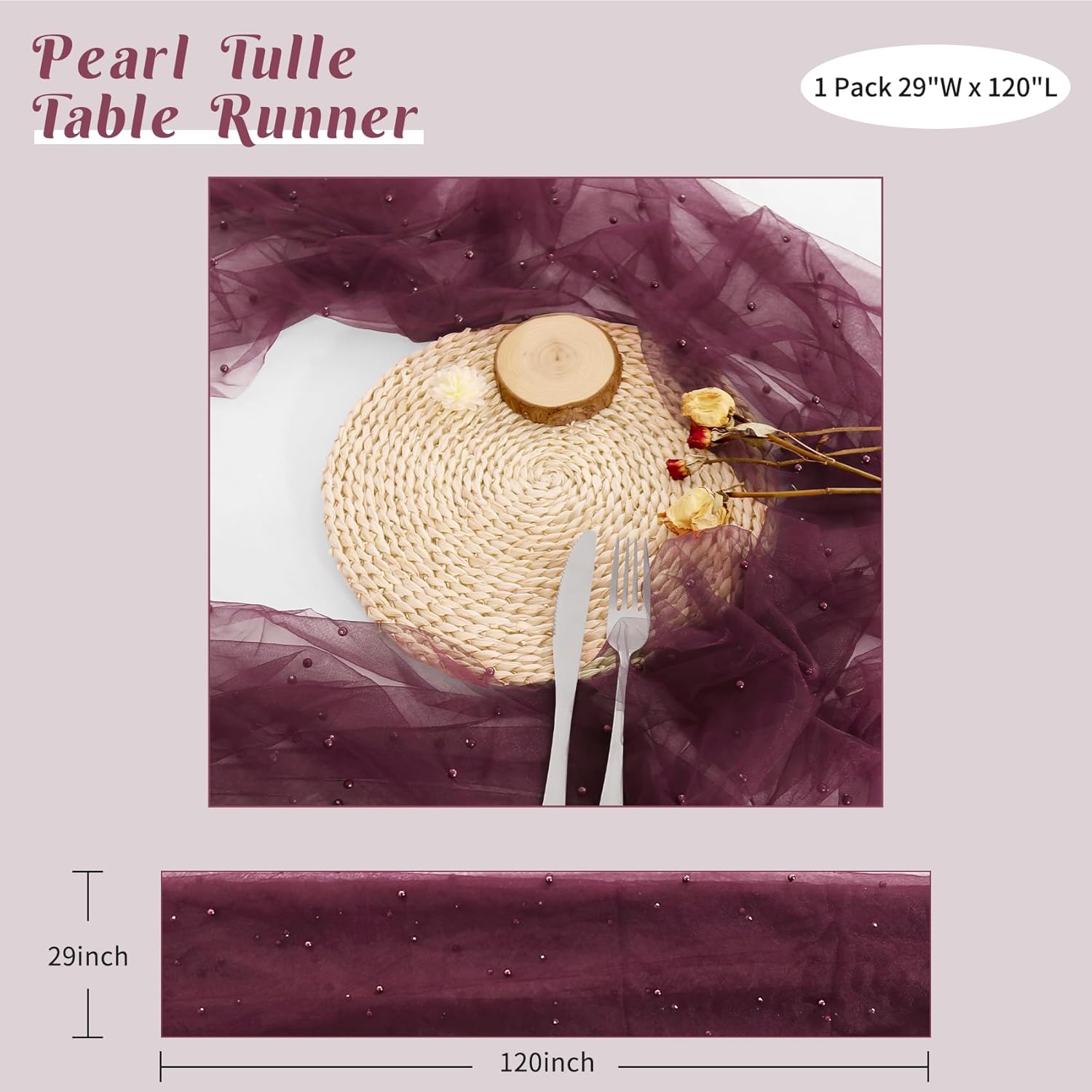 Pearl Table Runner 29 x 120 Inch Tulle Fabric Lace Table Runners Boho Rustic Tablecloth for Bridal Shower Birthday Party Wedding Arch Aisle Veil Dessert Table Decor(1 Pack, Burgundy)