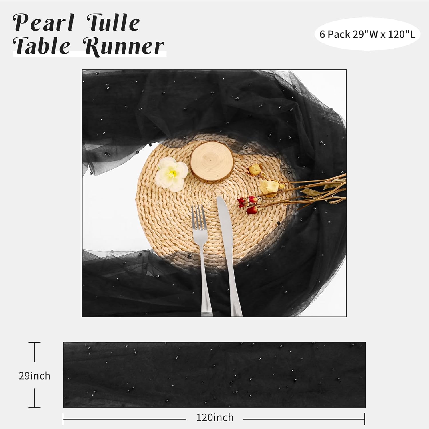 Set of 6 Pearl Table Runner 29 x 120 Inch Tulle Fabric Lace Table Runners Boho Rustic Tablecloth for Bridal Shower Birthday Party Wedding Arch Aisle Veil Dessert Table Decor(Black)