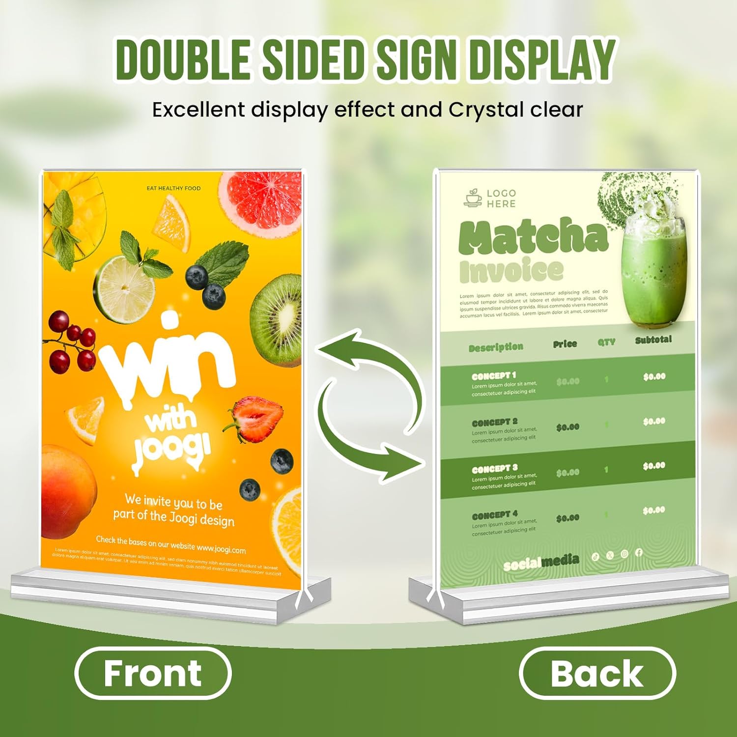 - 【Double Sided Sign Stand】This 25 Pack acrylic sign holder 5x7 is designed with a vertical double sided stand. Compared to the backward-tilted stand, the transparent menu holder adopts a vertical double-sided design, and both sides can display and protect pictures or posters, menus, etc., and are clearly visible.