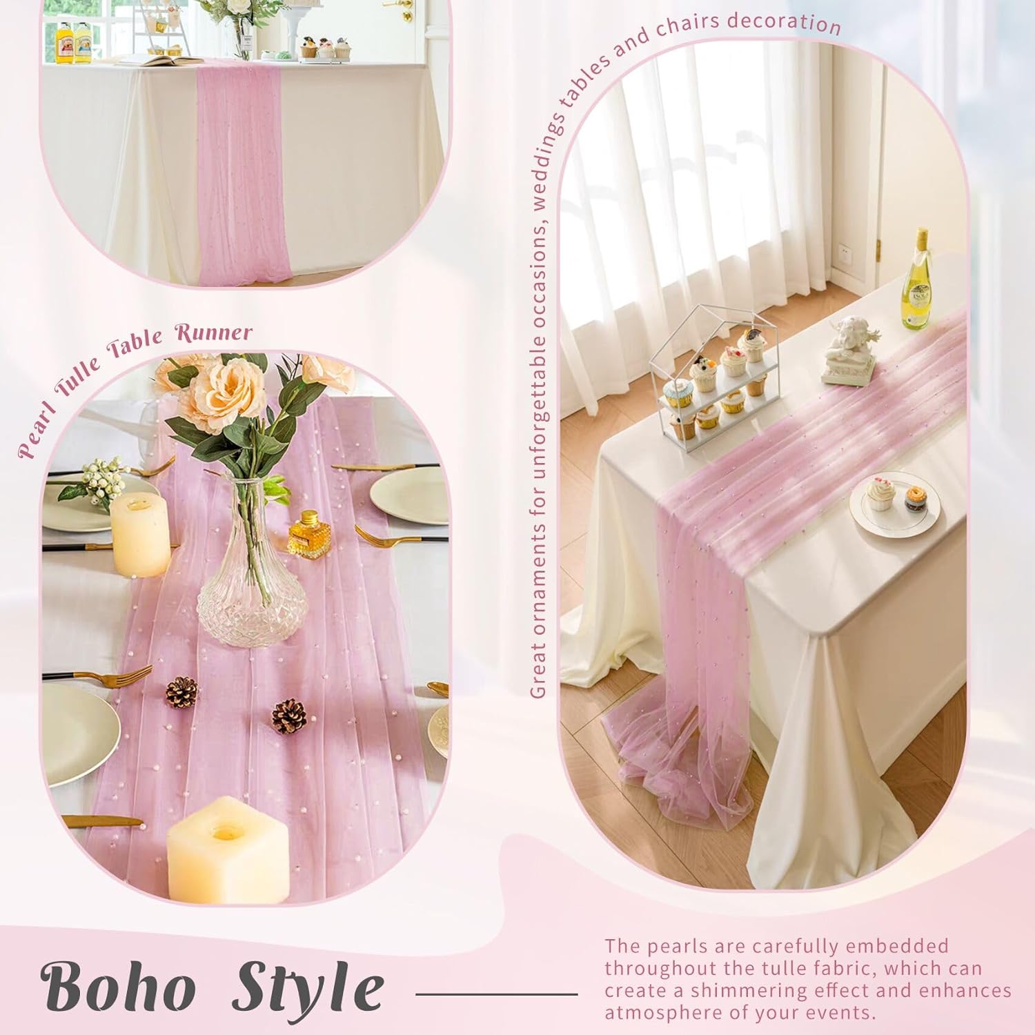 Set of 6 Pearl Table Runner 29 x 120 Inch Tulle Fabric Lace Table Runners Boho Rustic Tablecloth for Bridal Shower Birthday Party Wedding Arch Aisle Veil Dessert Table Decor(Pink)