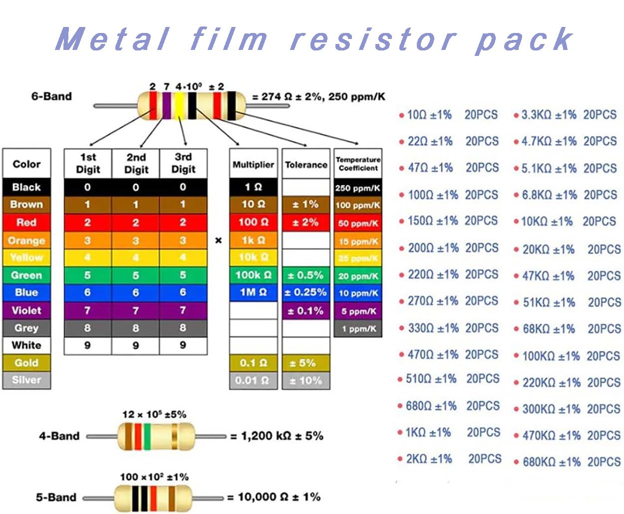 - Dual Labeling System: Features a user-friendly resistance/value dual labeling approach, making it easy to identify and choose the correct components for your projects, enhancing efficiency during assembly.