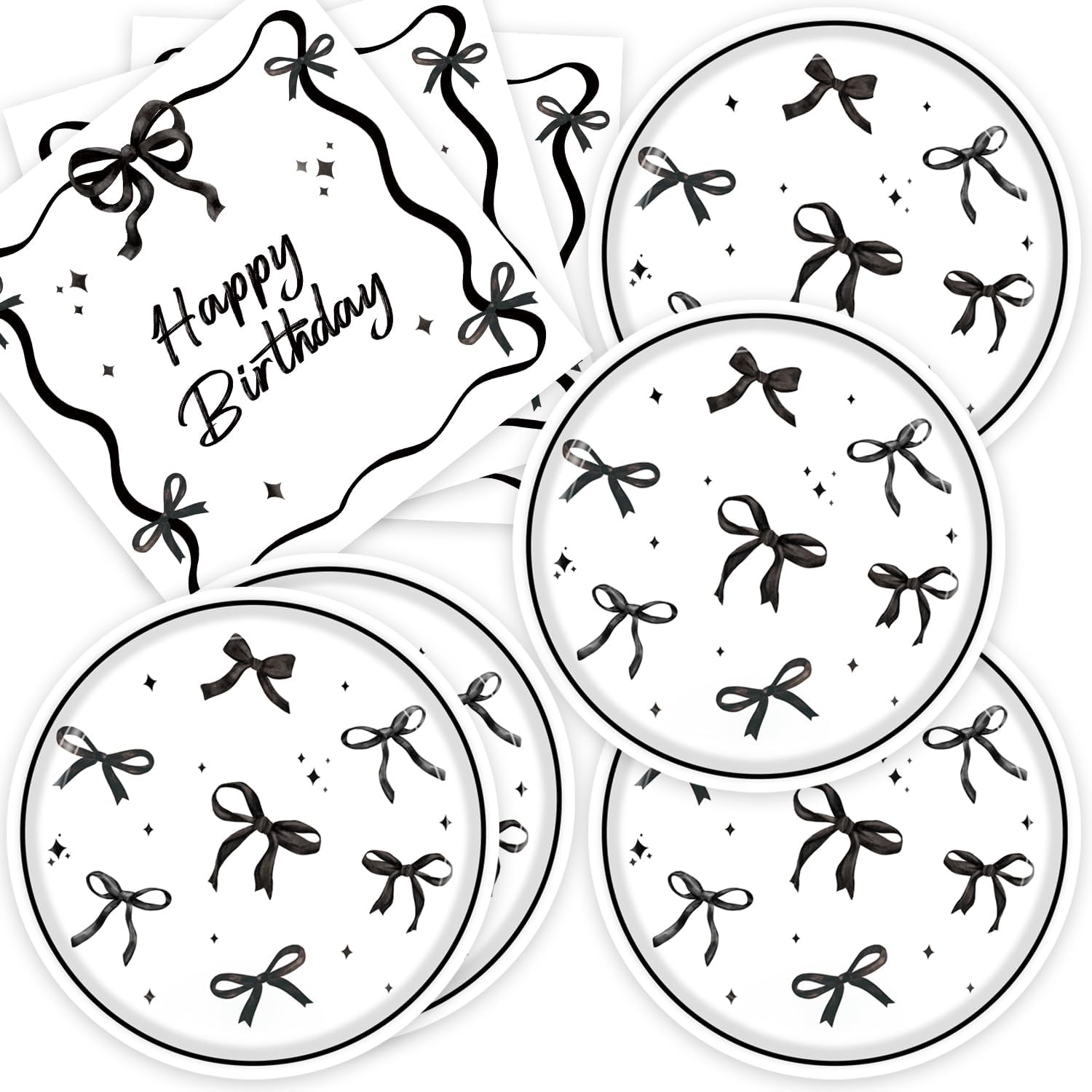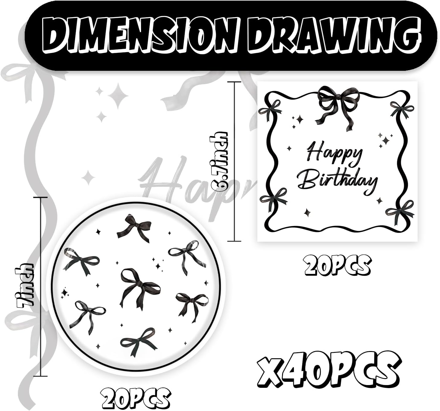 - Package Contents: Set includes 20pcs 7-inch Black Bow Birthday plates and 20pcs 6.7x6.7-inch Black Bow Birthday napkins, ensuring you have enough supplies for your guests.Convenient packaging makes it easy to store and transport.
