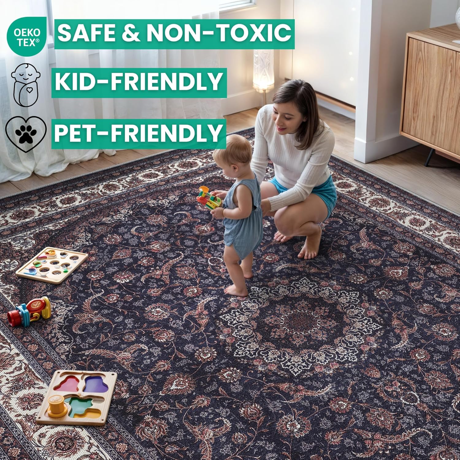 - EASY TO SETUP AND NON-SLIP: This one-piece machine washable rug with non-slip backing attached eliminates any additional setup. Simply unfold and lay flat upon arrival in the desired space. Non-slip backing prevents the rug from moving or sliding without the need for additional rug pad or grippers.