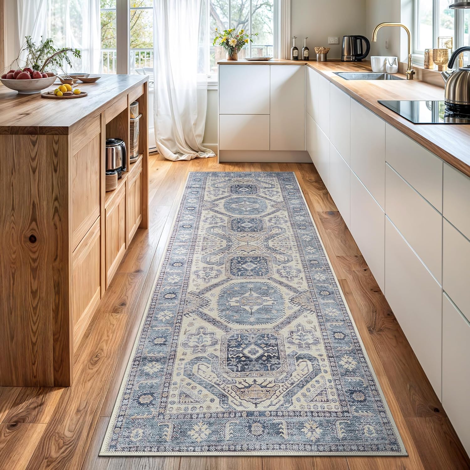 Bloom Rugs Washable Non-Slip 12 ft Runner - Blue/Beige Traditional Oriental Runner for Entryway, Hallway, Bathroom, and Kitchen - Exact Size: 2.5' x 12'