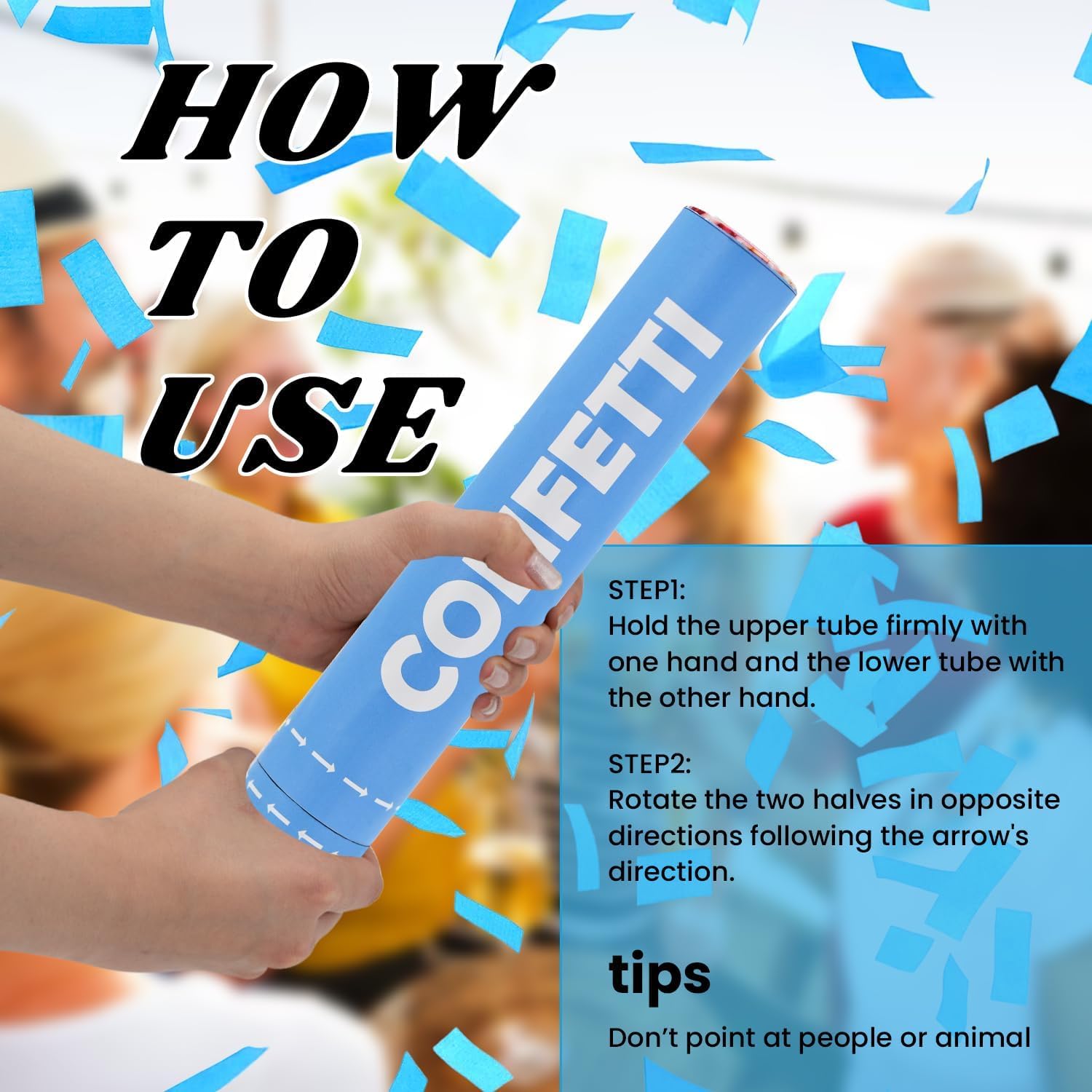 - 【Before Use Confetti Cannon】In order to provide you with a better experience with confetti poppers and avoid being unable to twist, Please read the instructions and tear open the packaging paper at the bottom of the popper, then easy to twist it!