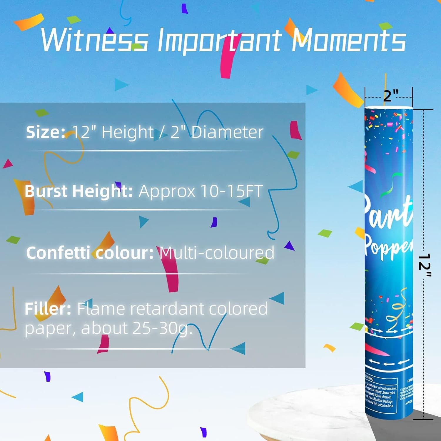 - CONFETTI CANNON 12 PACK - High quality party poppers confetti shooters,The length of the confetti cannon is 12 inches,adequate confetti content,biodegradable multicolor confetti are sprayed in the air and pushing the party atmosphere to a climax,with confetti spraying out,we cheered and were immersed in happiness