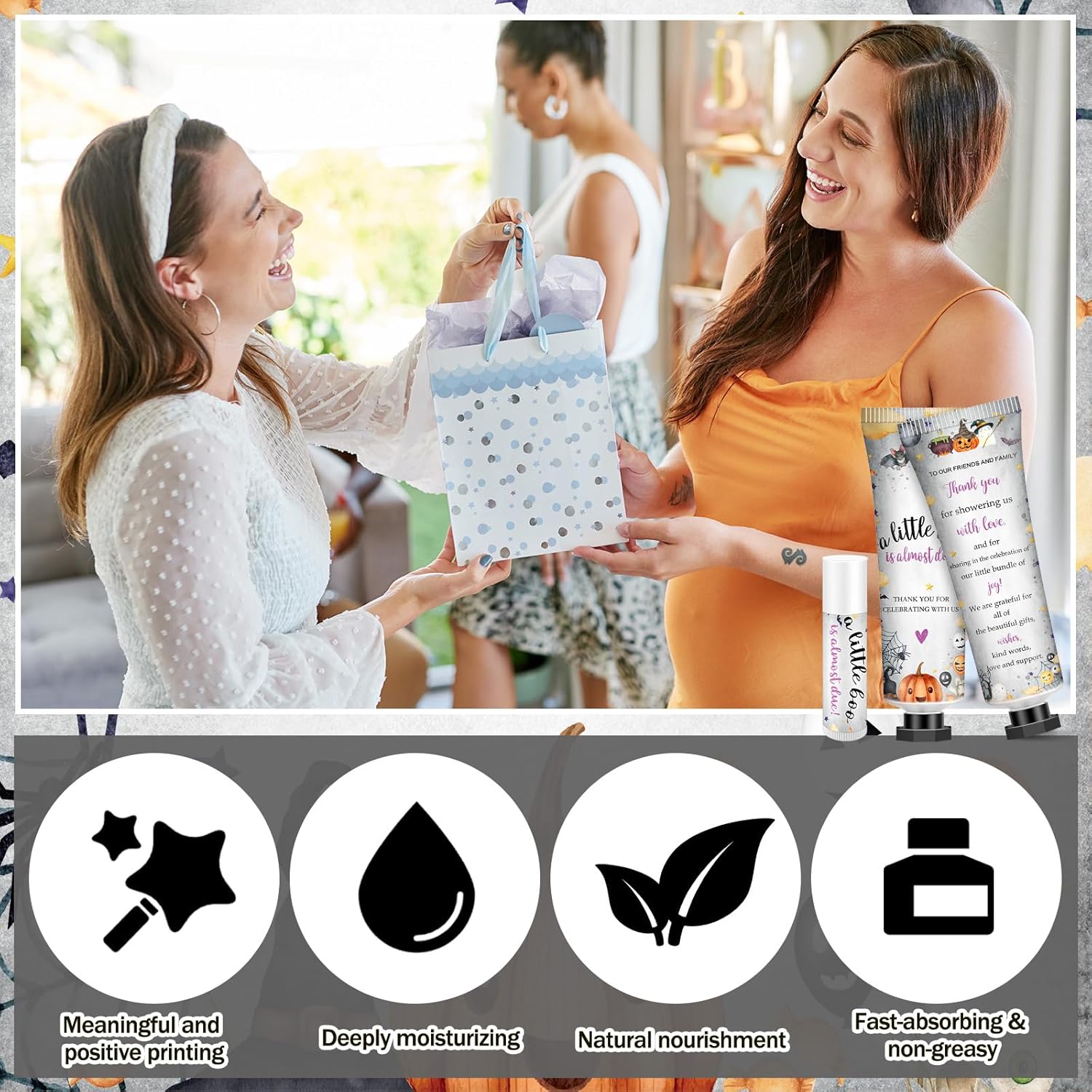 - Exquisite Little Boo Themed Design: ghosts and spider webs patterns and the warm and thankful words like [a little boo is almost due], enhance the gift giving atmosphere; This ensemble of hand lotion and lip balm lifts up the charm quotient of any event whilst bringing a sense of unexpected joy