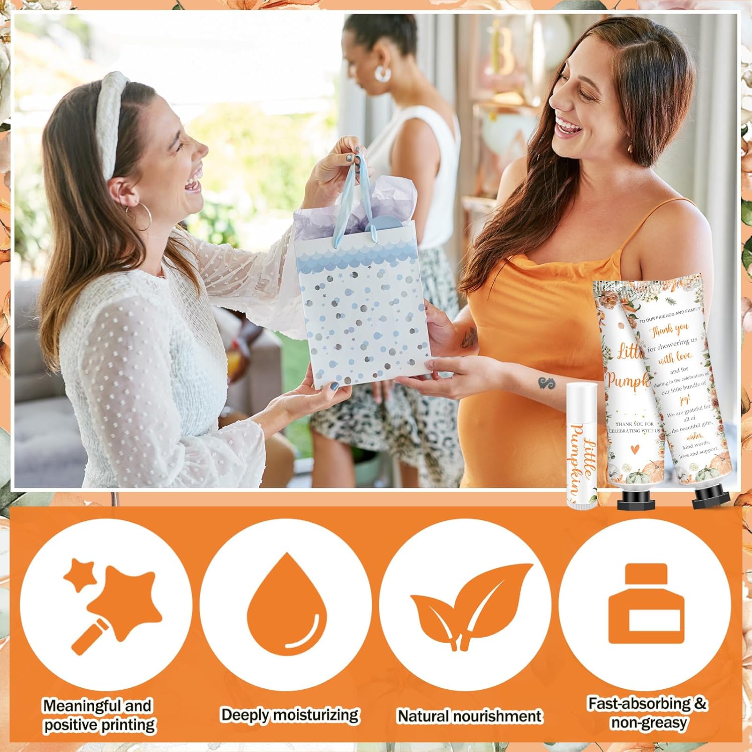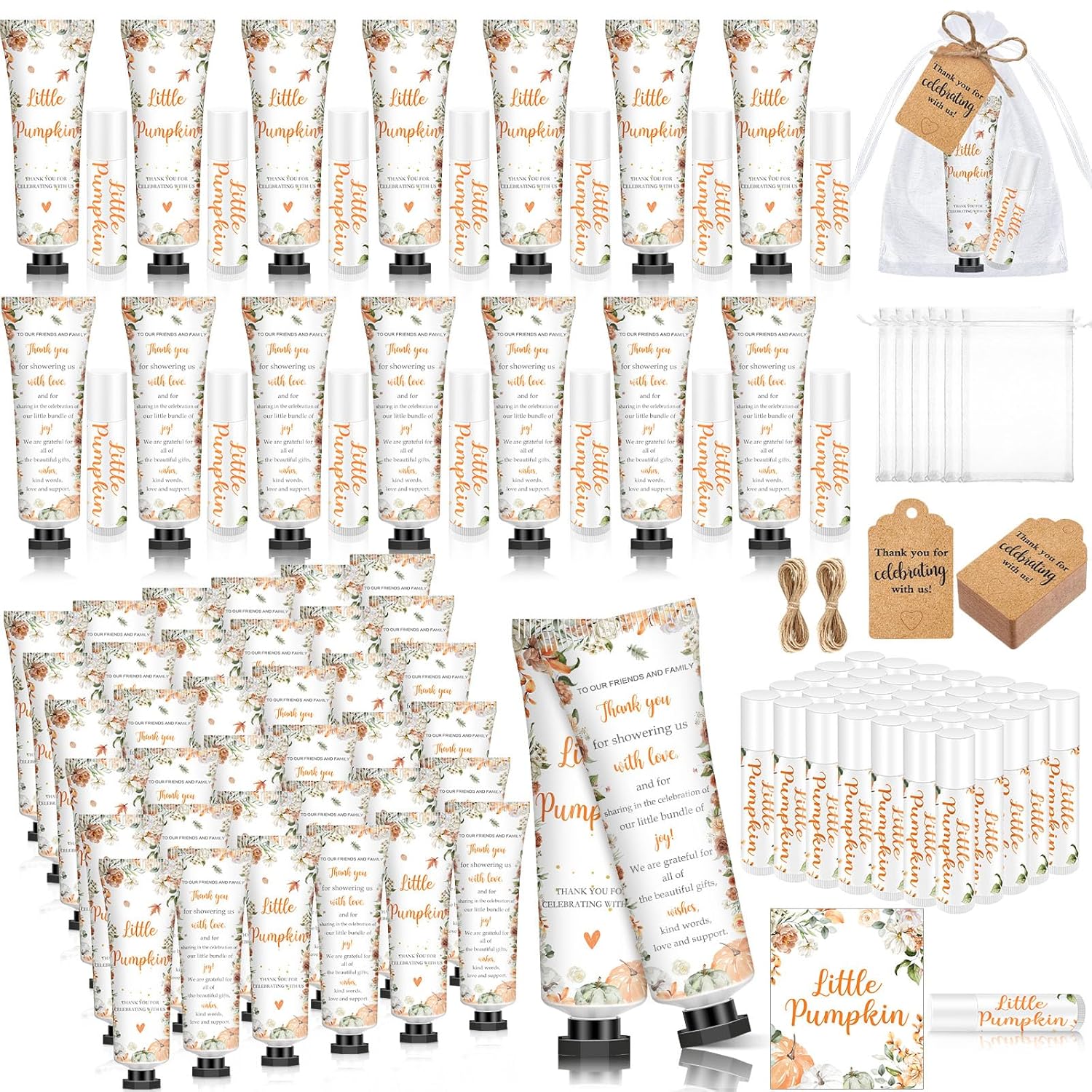 50 Sets 200 Pcs Baby Shower Hand Lotion and Lip Balm Gift Theme Baby Shower Party Favors Travel Size Hand Lotion and Lip Balm Bulk with Organza Bags Tags (Little Pumpkin)