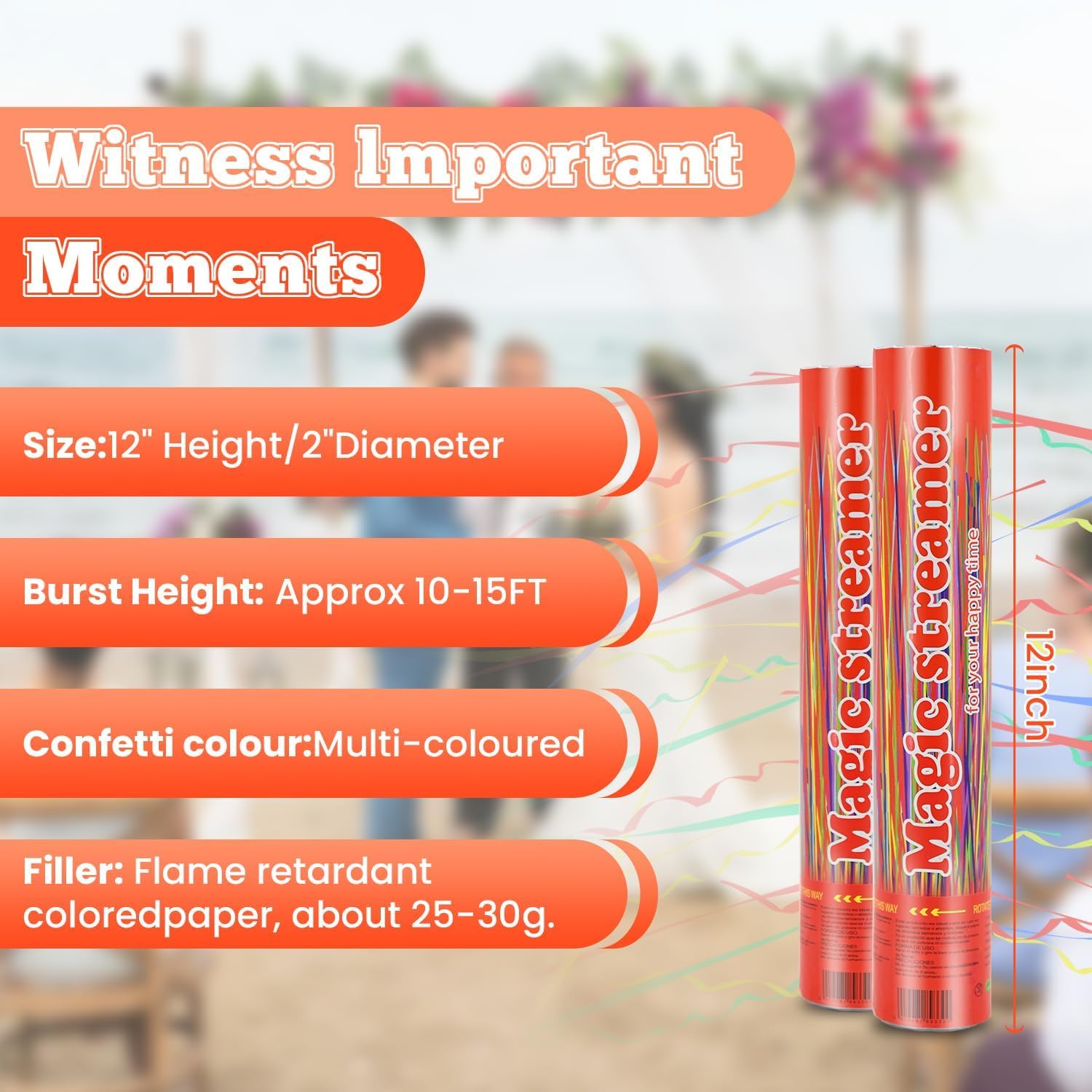 - 【12 Inch Multicolor Confetti Cannon】100% paper confetti poopers can break down organically and non-toxic. Multi-color streamer popper confetti cannon are both green and easy to clean, multicolor party poppers confetti shooters work well indoors and outdoors.