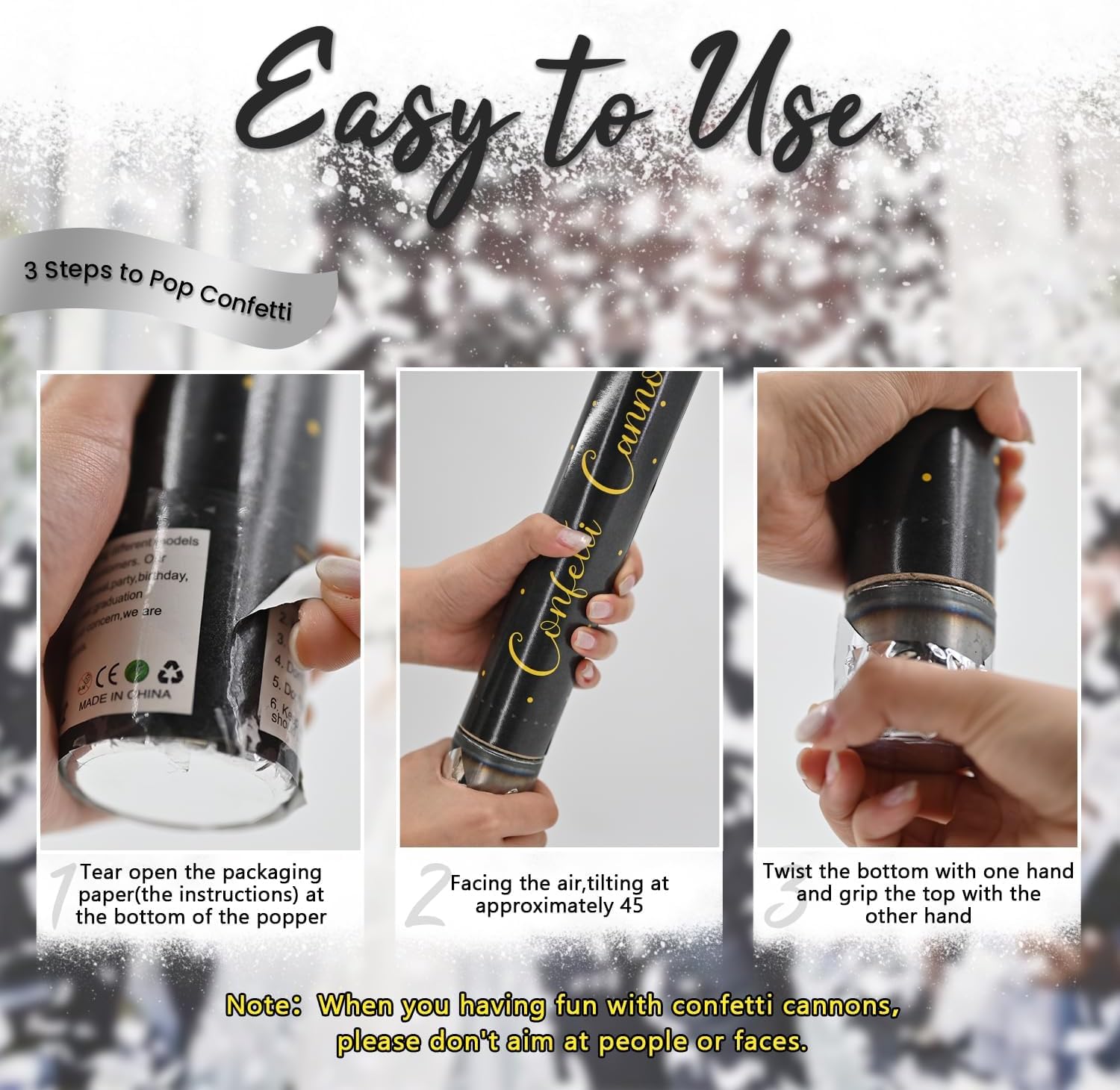 - Before Use Confetti Cannon:In order to provide you with a better experience with confetti poppers and avoid being unable to twist, Please read the instructions and tear open the packaging paper at the bottom of the confetti cannon, then easy to twist it!