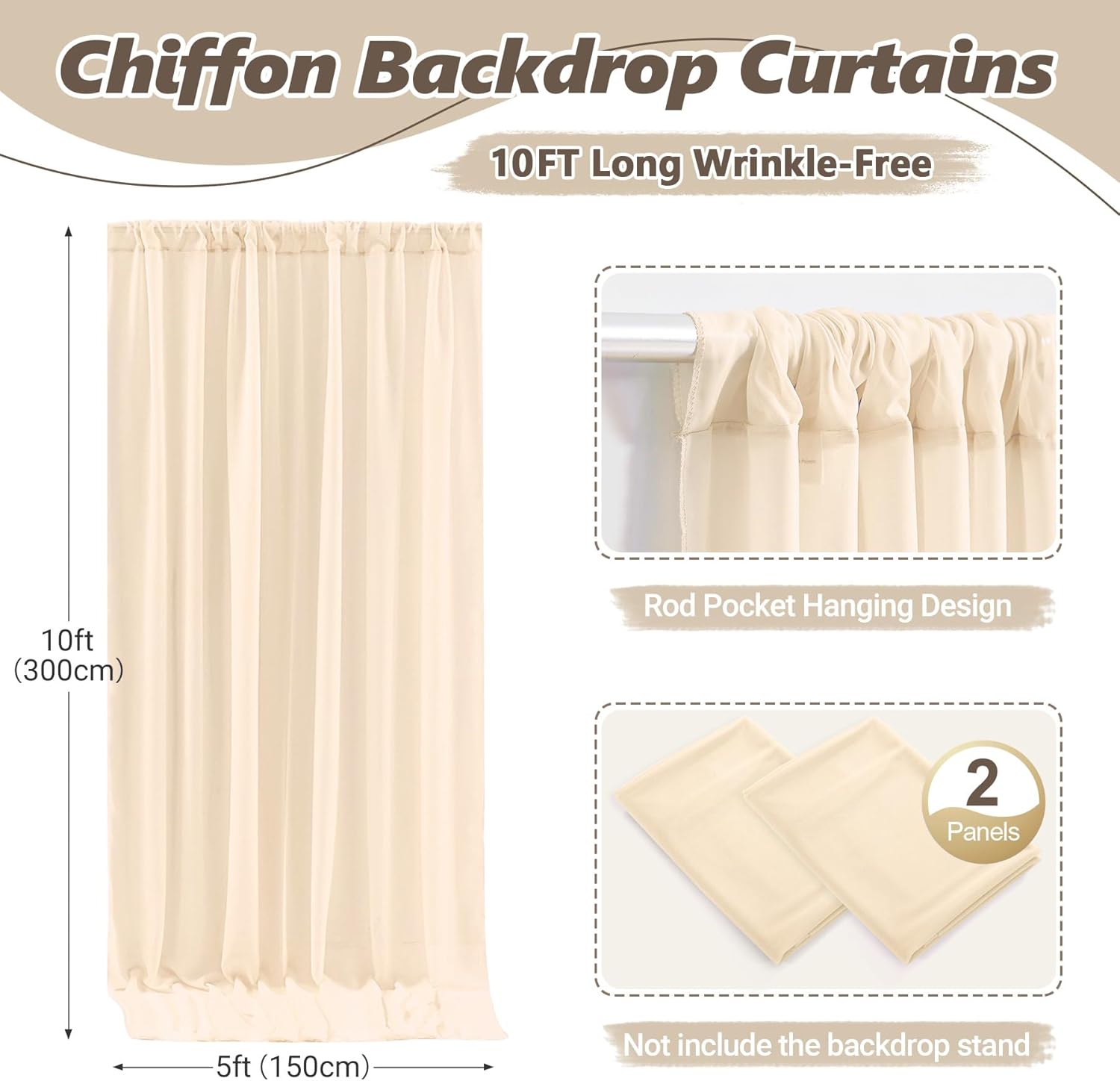 10ft x 10ft Champagne Backdrop Curtains, Wrinkle-Free Sheer Chiffon Fabric Photo Backdrop Drapes for Wedding Arch Party Ceremony Stage Photography Decorations