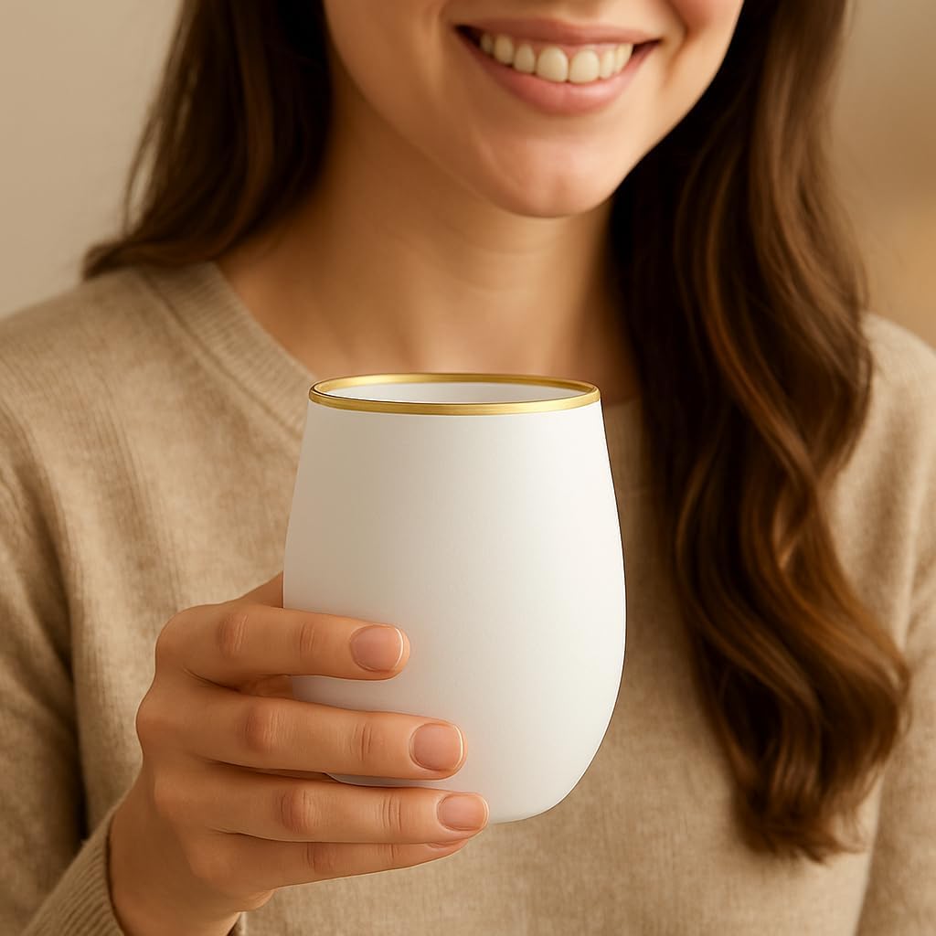 40 count Unbreakable Stemless Plastic Wine Champagne Whiskey Glasses Elegant Durable Disposable Indoor Outdoor Ideal for Home, Office, Bars, Wedding, 12 Ounce Cups Gold Rim (White Matte Gold)