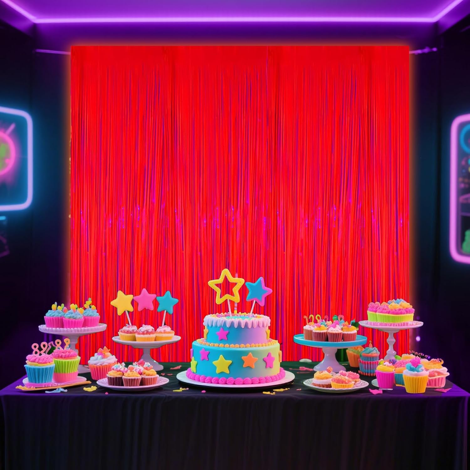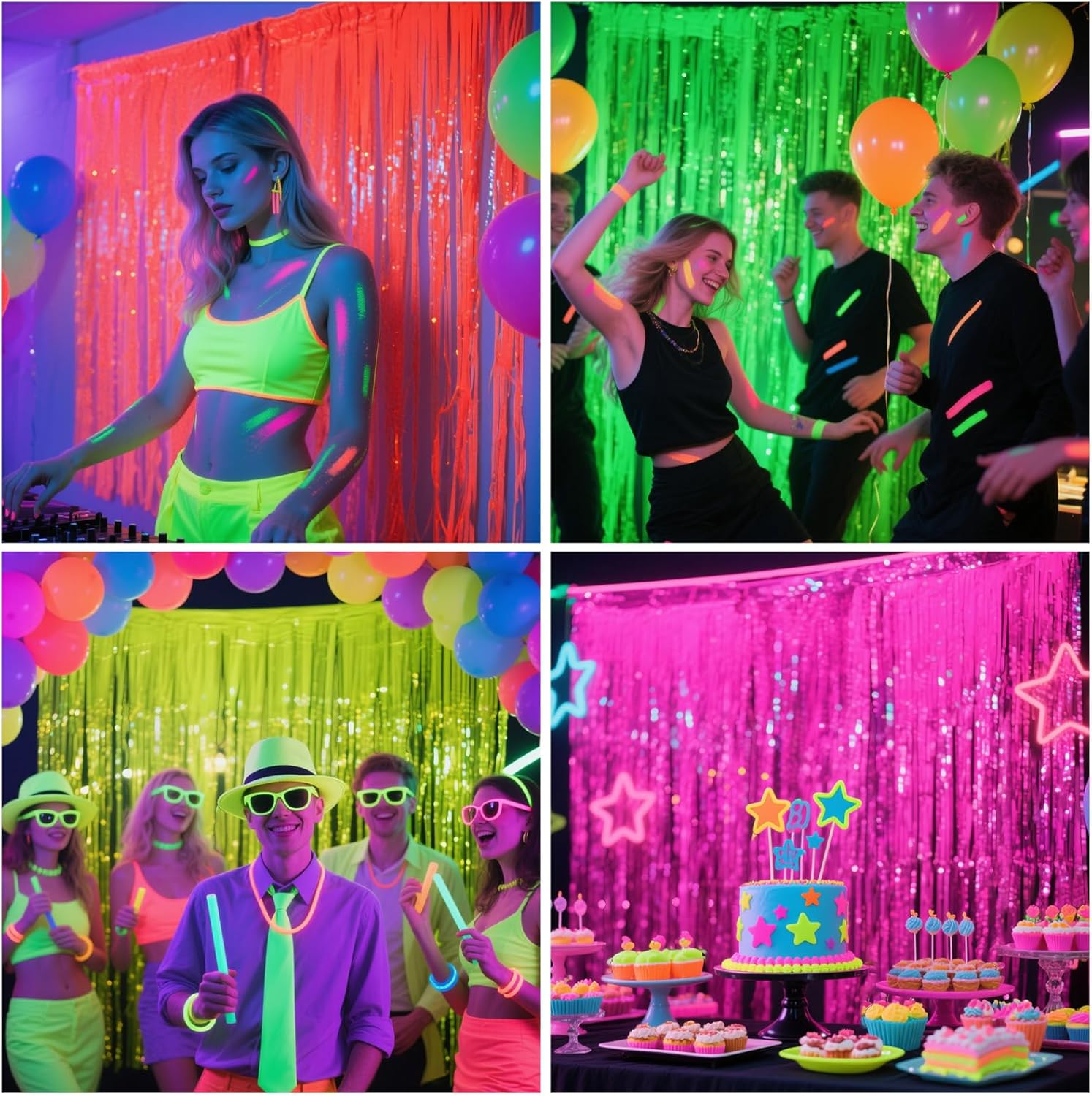 - Glow in the Dark Party Supplies: You will get 4 pcs fluorescent macaron orange tinsel backdrop, size: 6.6ft*3.3ft. The foil fringe curtains are perfect for blacklight dark glow party decorations, on the door or wall to create an impressive decoration for parties, events, and photo booths.