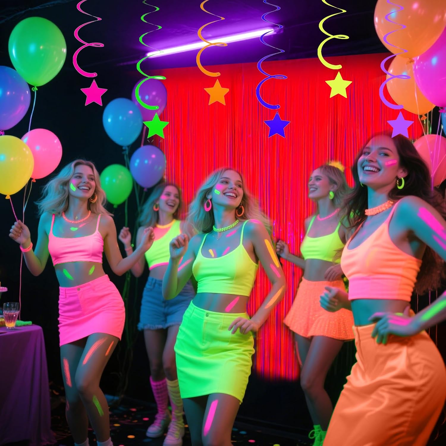 - Multi-Use Function and Occasions: These glow in the dark decorations suitable for blacklight party, neon party, fluorescent parties, disco bachelorette party, birthday party, euphoria party, carnival, dance party, wedding, holiday carnivals, graduations, anniversaries, retirement, banquets, holiday celebrations, Halloween, Christmas, school events or occasion that blacklight party is required. Glow in the dark streamers for parties to make your party perfect and fun. Your guest will love them and take photo with them.