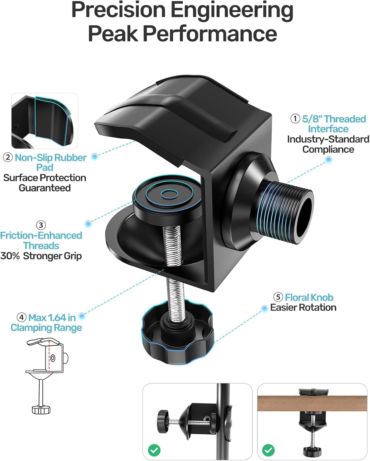 - [Multi-Purpose Clamping System] Crafted from premium aluminum alloy, the U-shaped super crab clamp is engineered for rock-solid grip on desk / pole / stand / rod / stick / shelf / tube. It securely mounts to floor stands, enabling simultaneous vocal and instrumental performances without taking up extra floor space. With anti-slip pads and threads, the clamp reduces vibration, ensures a stable installation, and protects the pole's surface. Additionally, it accommodates desktop edges up to 1.53 inches thick for versatile mounting solutions.