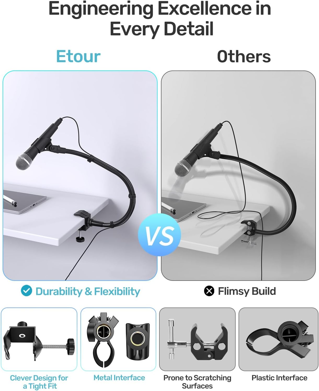 - [Your Ultimate Versatile Audio Partner] This gooseneck mic holder delivers pro audio anywhere: Clamp the gooseneck stand to piano for studio recordings, attach to floor music stand / drum for street performances, or mount on desks for conference calls and podcasts. Effortlessly switch between streaming, lectures, and home studios.