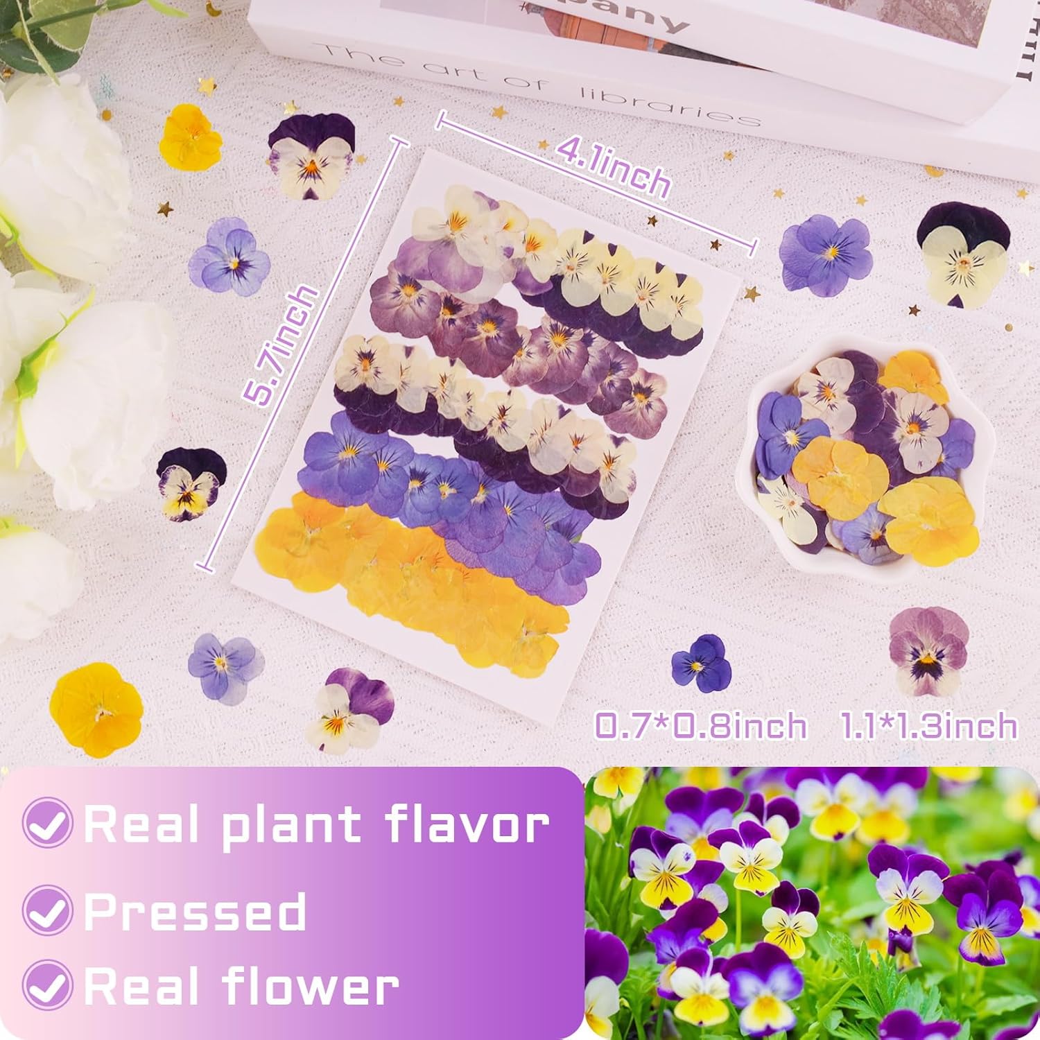 - 【Dried Pressed Flower Cake Toppers】: Each package contains about 40 pieces, featuring 5 vibrant hues that transition seamlessly from deep purple to lavender, white, and sunny yellow. This dried pressed flower creates captivating multi-dimensional effects for your DIY projects. These artistic decorative pressed flowers are carefully air-dried using traditional techniques to preserve their natural beauty, with each piece varying slightly in size and shape