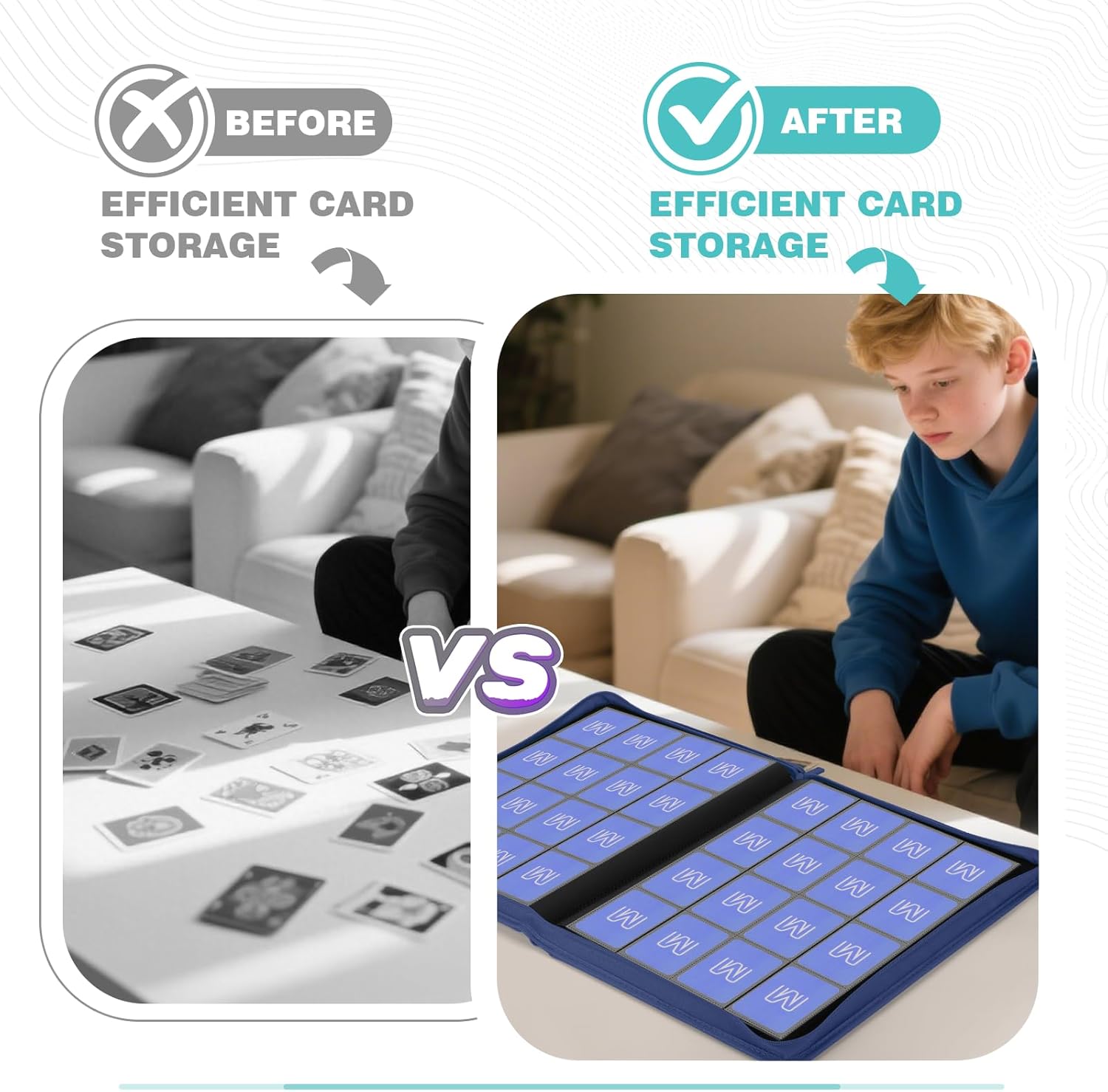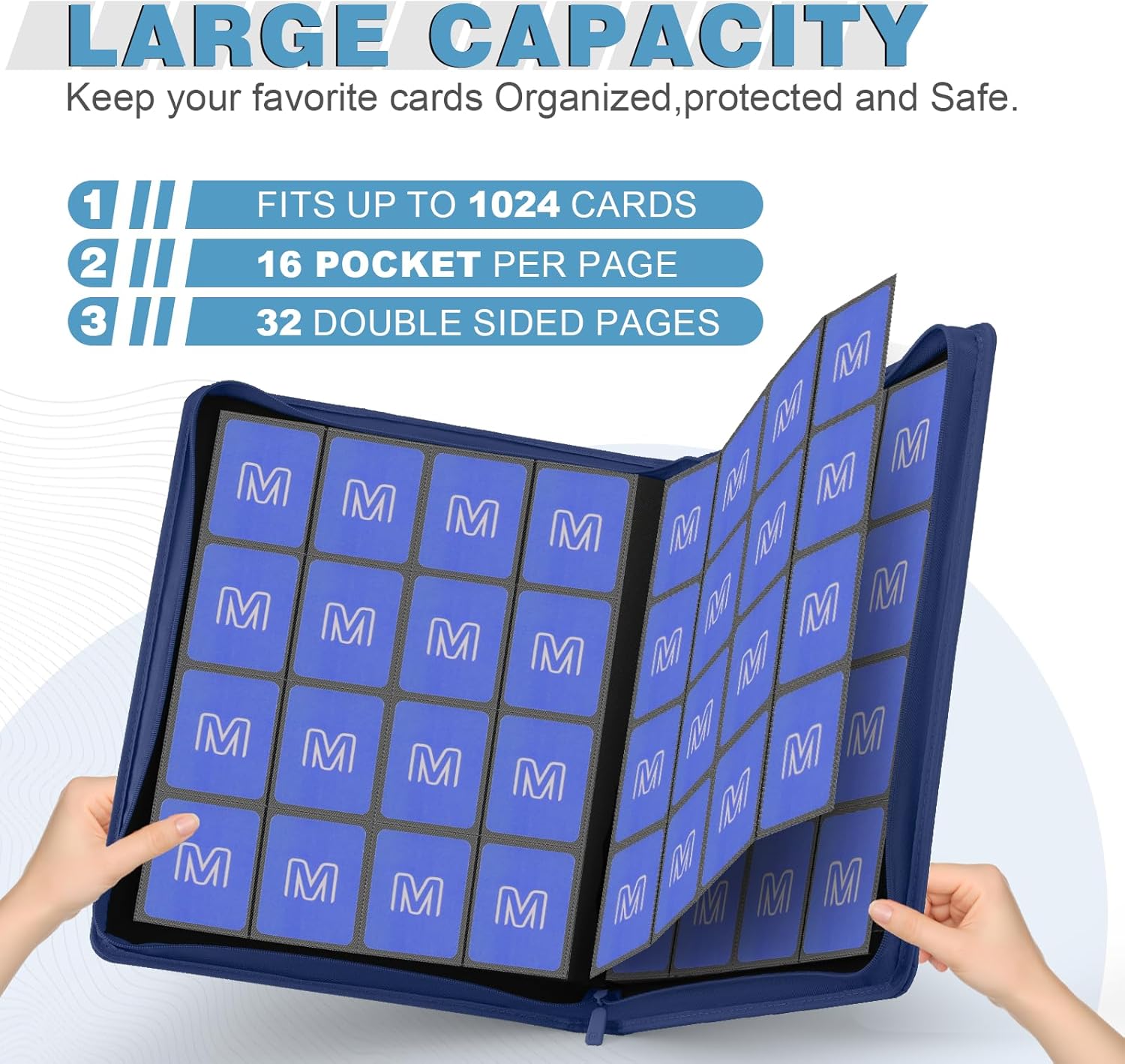 - 【LARGE CAPACITY 】It features an interior suede lining, providing a luxurious touch and ensuring durability.Our card binder holds up to 1024 trading cards with 16 pockets per page,both sides can hold cards,totalling 32 pages.Large storage capacity to meet your card collection needs ,keep all your cards organised.