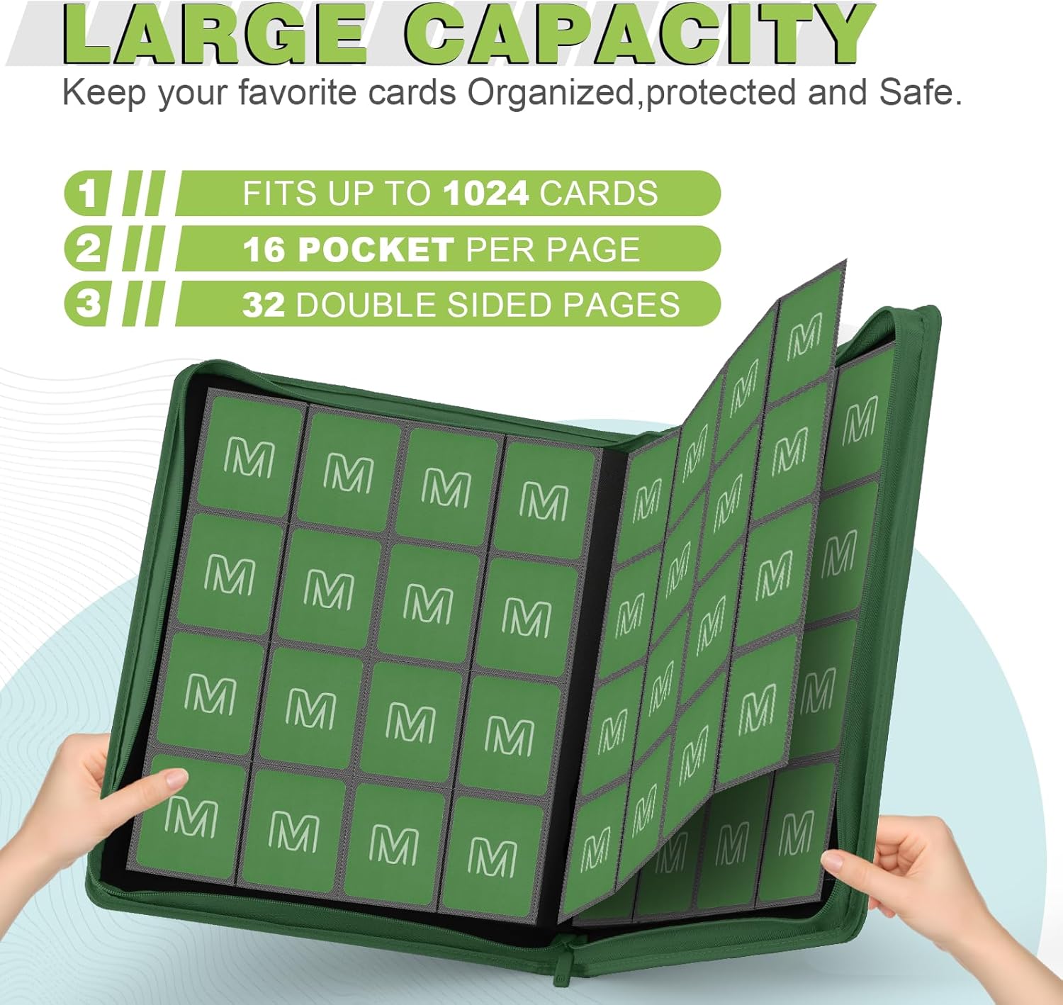 - 【LARGE CAPACITY 】It features an interior suede lining, providing a luxurious touch and ensuring durability.Our card binder holds up to 1024 trading cards with 16 pockets per page,both sides can hold cards,totalling 32 pages.Large storage capacity to meet your card collection needs ,keep all your cards organised.