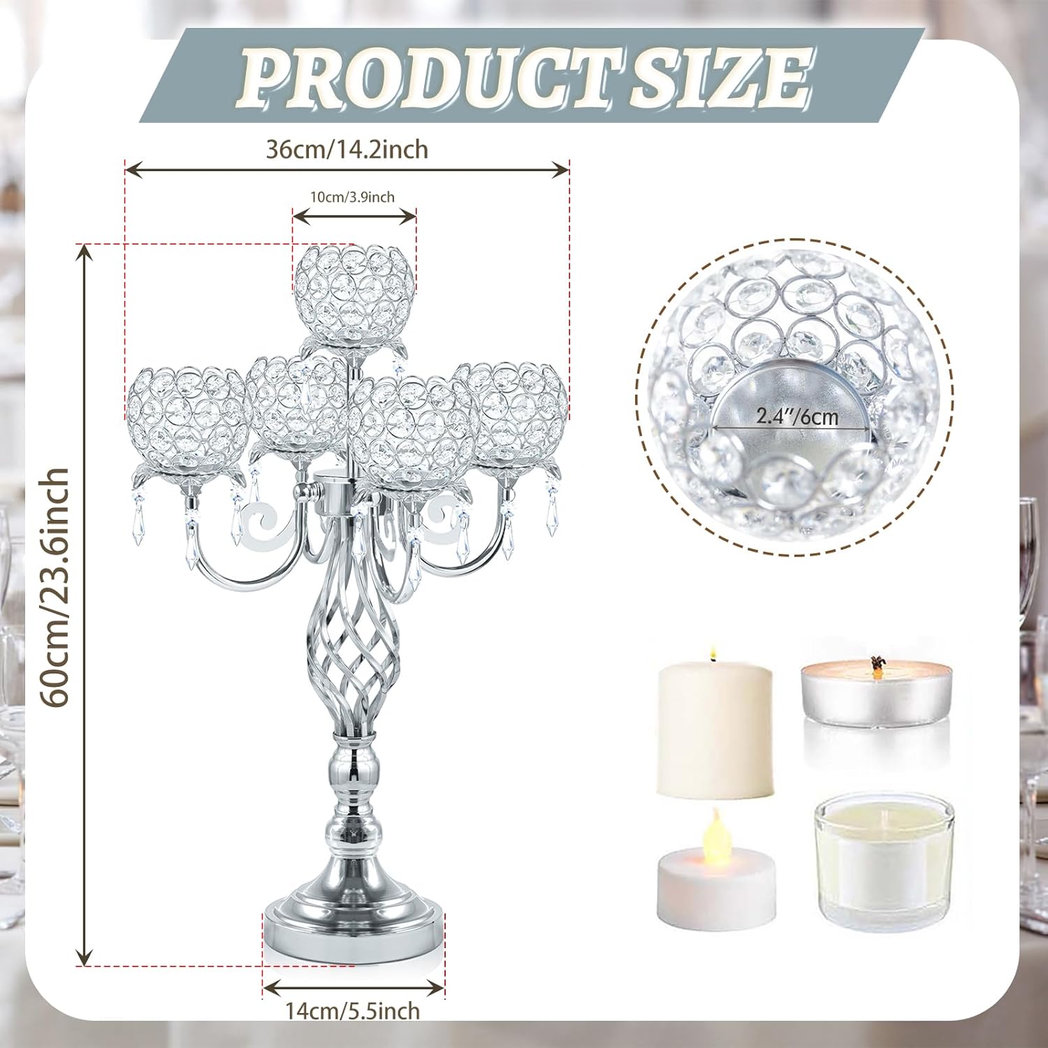 5-Arm Crystal Candelabra Centerpiece 23.2" Tall - Elegant Candle Holder Stand with Crystal Bowl, Chic Table Decor for Weddings, Parties, Anniversary & Home Decoration (4, Silver)