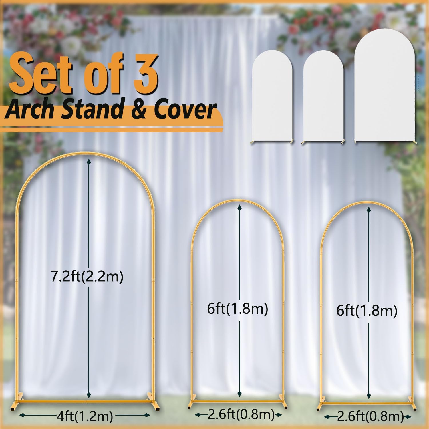 - Arch Backdrop Stand and Covers Set Package contains 3 Gold arches stand for wedding and 3 White Spandex arch backdrop covers with dimensions of 7.2FT and 6FT.x2. A large tote bag,3 x storage bags, A pair of protective gloves,12 Pcs Outdoor Landscape Staples.