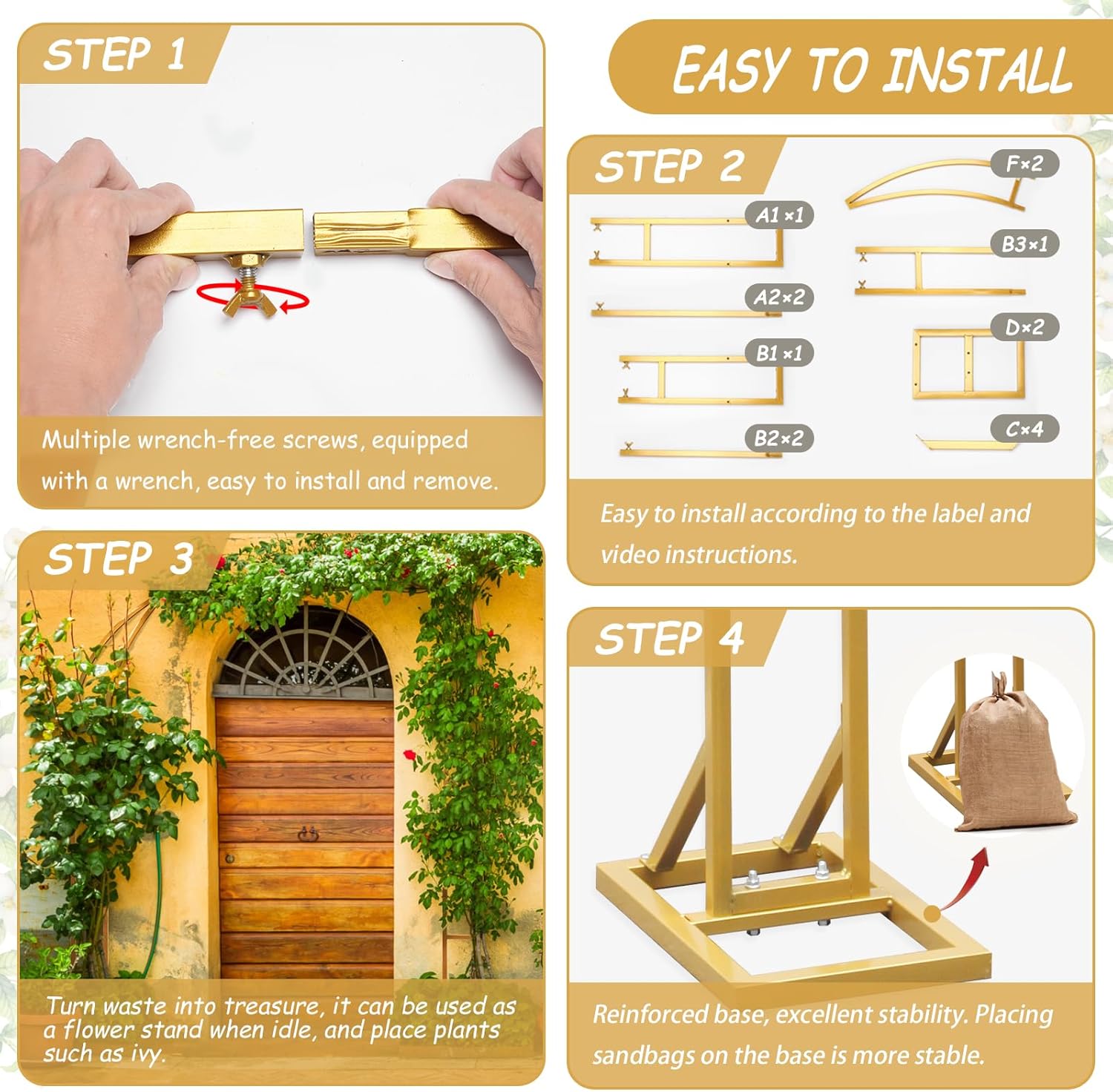 - 【Elegant & Sturdy Wedding Arch 】: The Curved wedding arch frame is made of high-quality metal by die-casting, polishing, spraying, and other processes, strong, sturdy, and not easy to deform. The shiny golden powder coated on the surface prolongs service life anti-rust and corrosion-resistant. It's perfect as a wedding arch, balloon arch stand, or garden arch for gardens displaying beautiful climbing plants like vines and roses,and suitable for both indoor and outdoor events.
