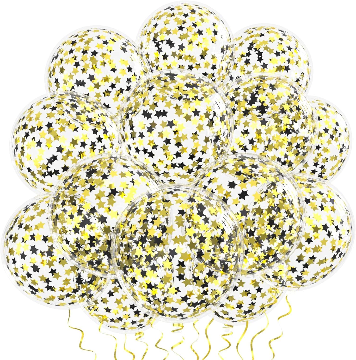 VHUWE 25 Pcs Black Gold Star Confetti Balloons, 12 Inch Clear Latex Balloon with Confetti Inside for Birthday Party Baby Shower Graduation Engagement Bridal Shower Decorations Supplies - Star Confetti